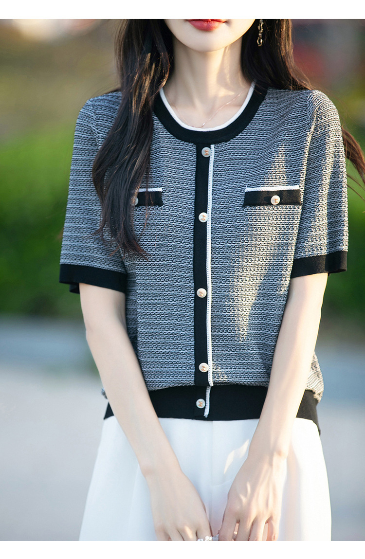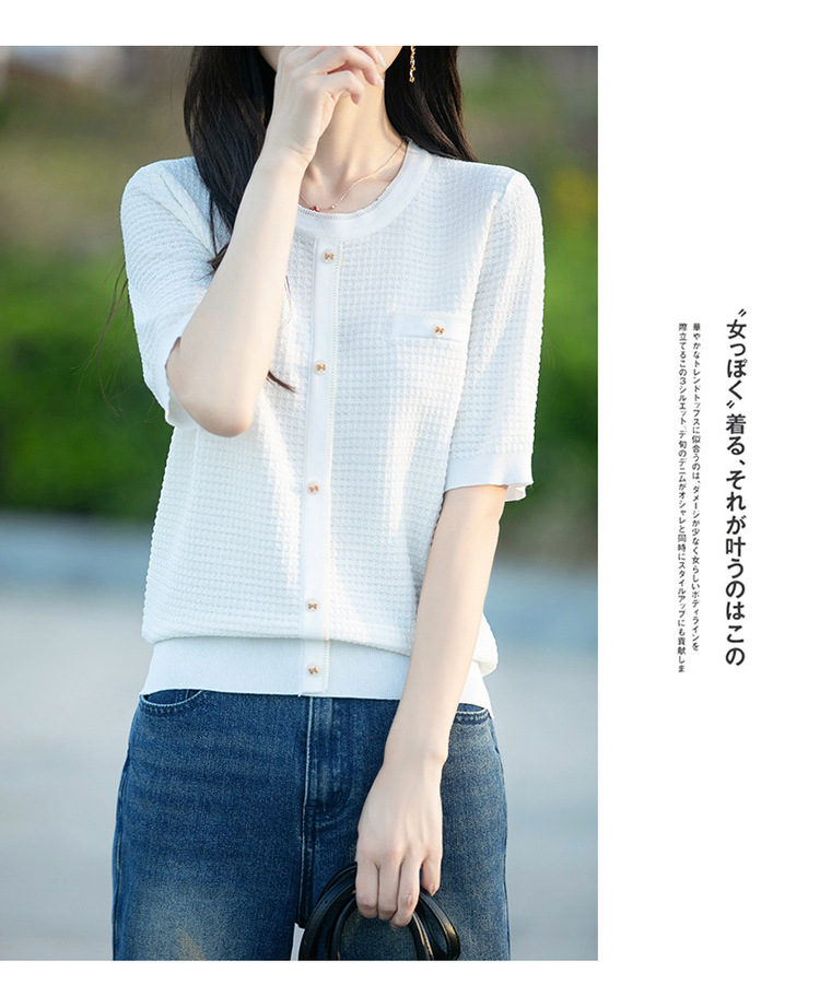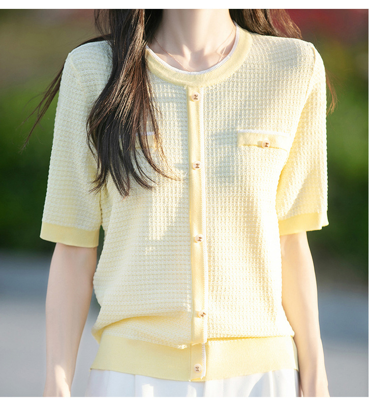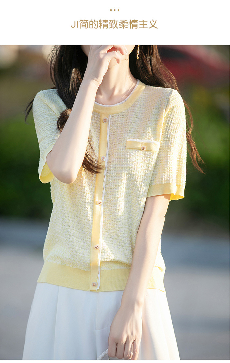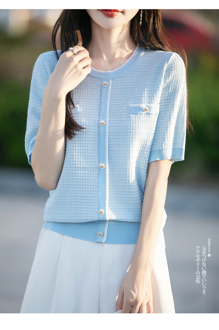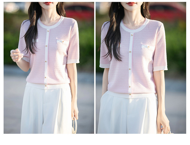 2025年春夏新作小香風氷糸丸首ニット半袖色合わせ偽カーディガン