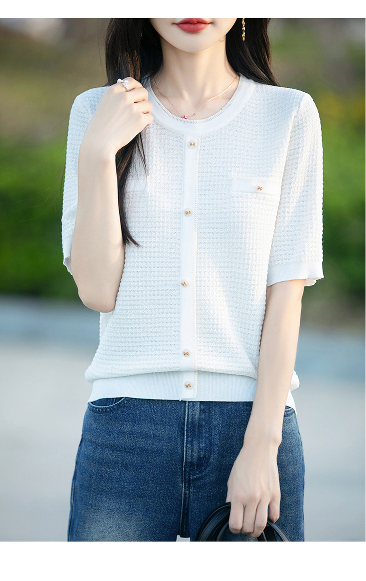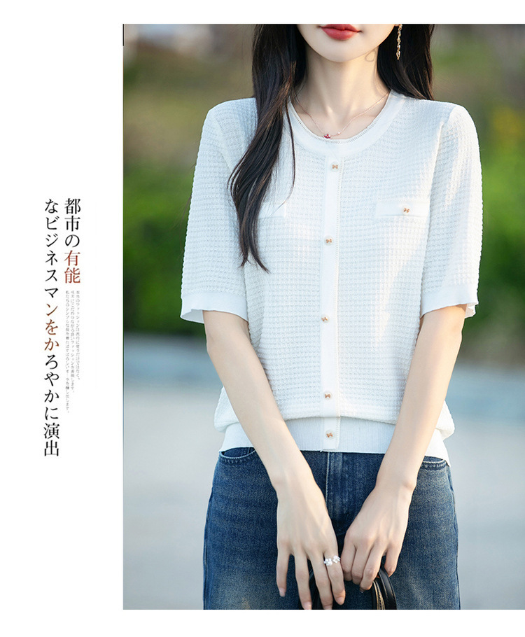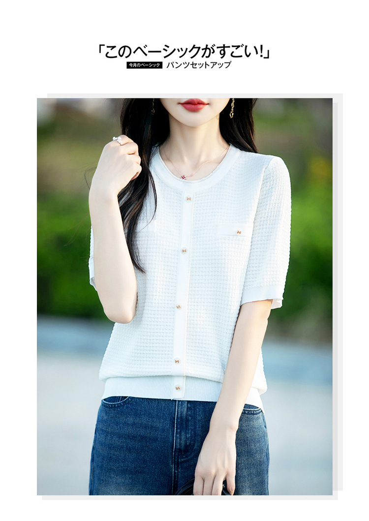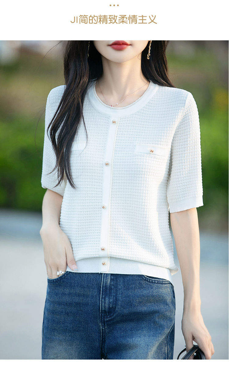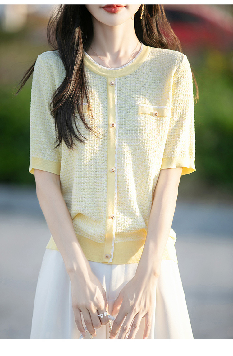 2025年春夏新作小香風氷糸丸首ニット半袖色合わせ偽カーディガン