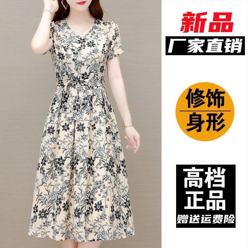模造アイスシルクレトロプリントドレス女性の夏の新しい半袖プリントミッドレングス中高年ママスカート
