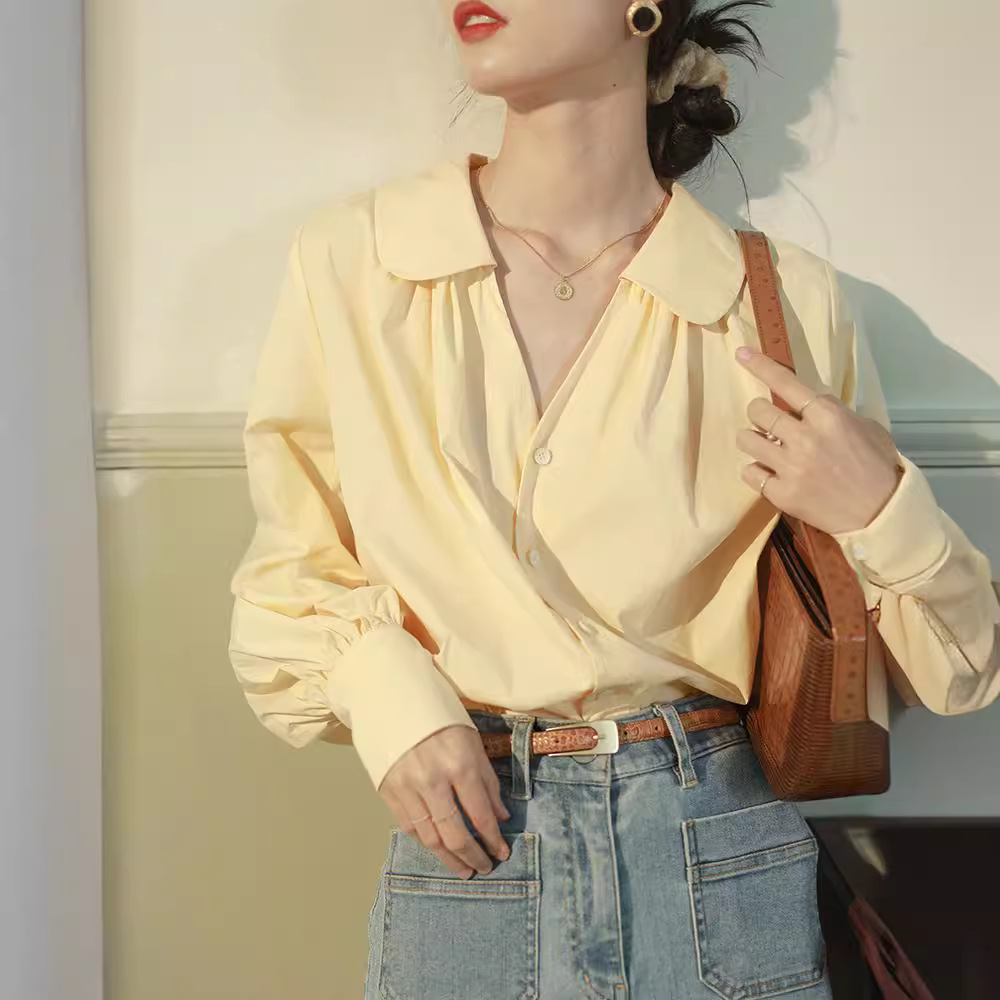 ドールカラーシャツ レディース 2026 春秋デザイン フレンチレトロ風 骨抜き襟付き ランタンスリーブトップス