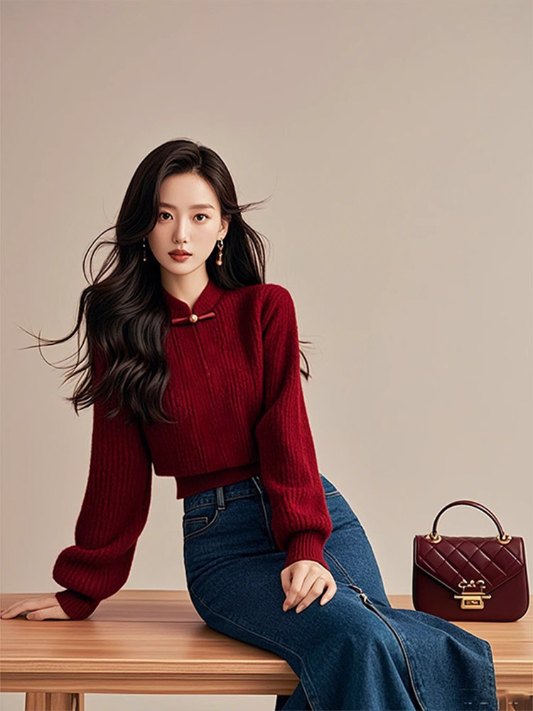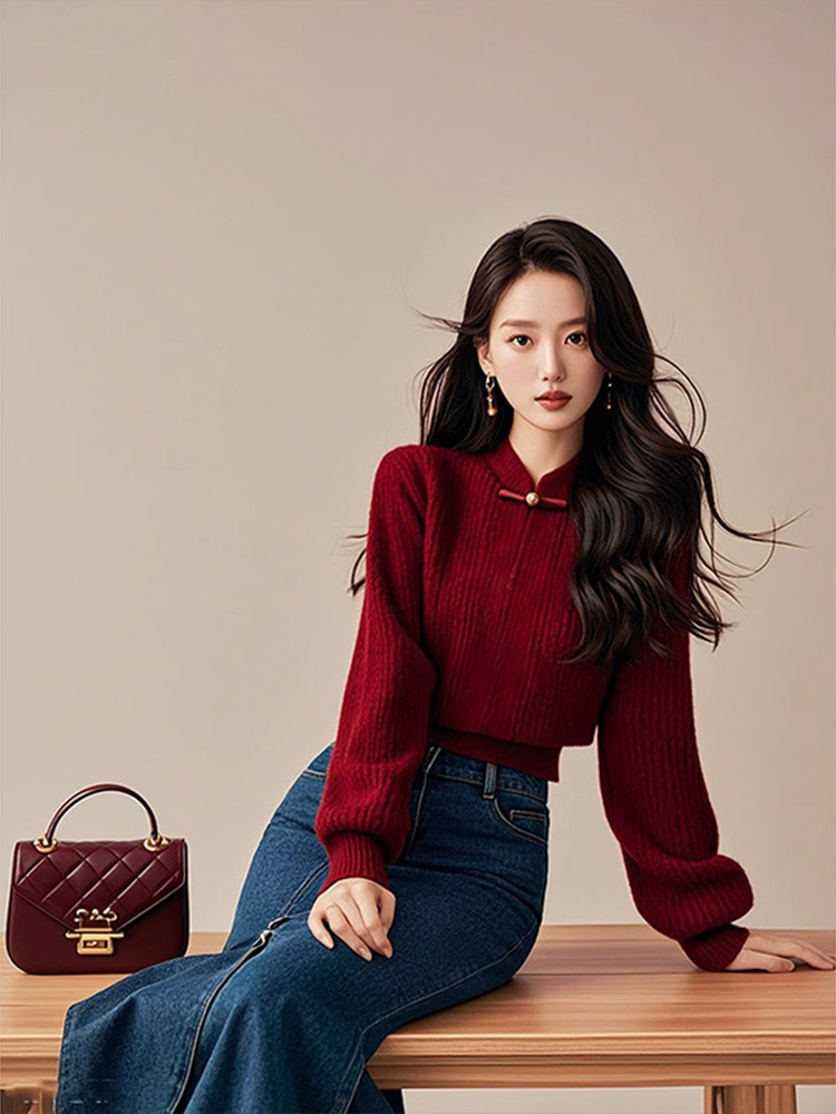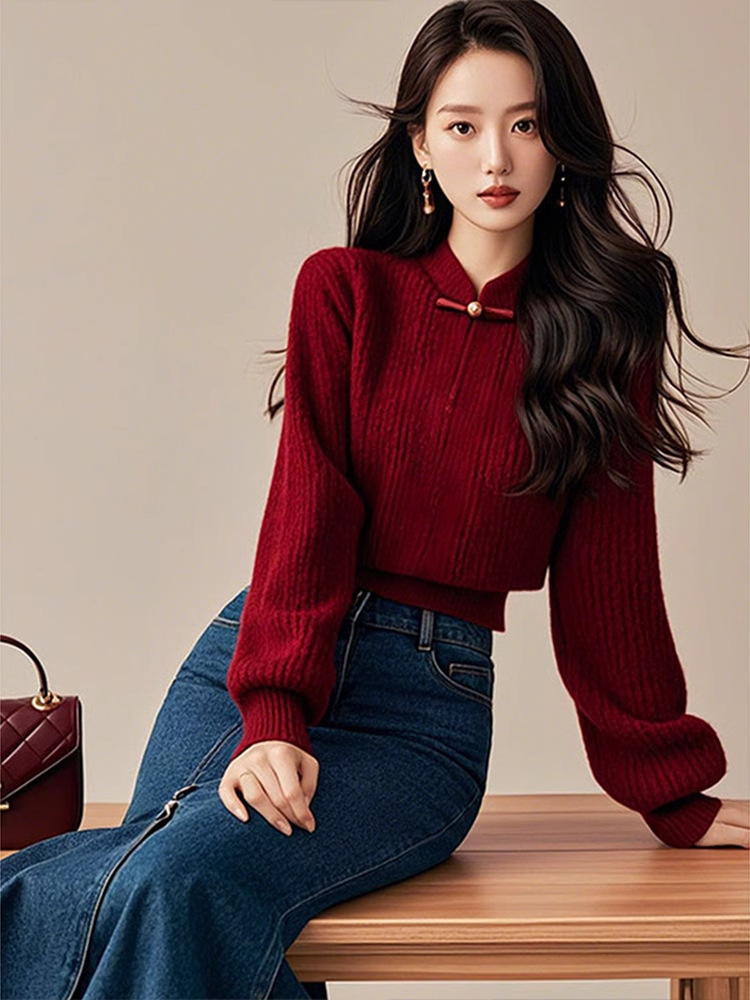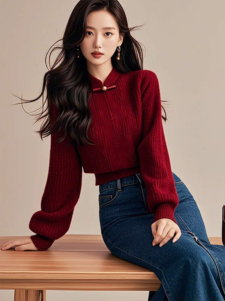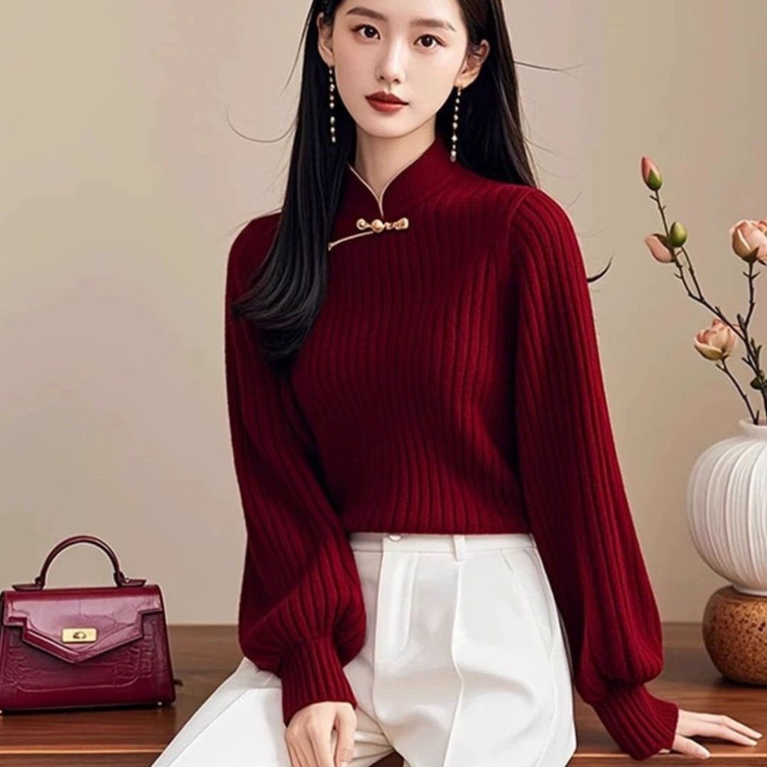 公羽翁新款红色打底秋冬新款新中式轻国风红色盘扣毛衣国风灯笼袖