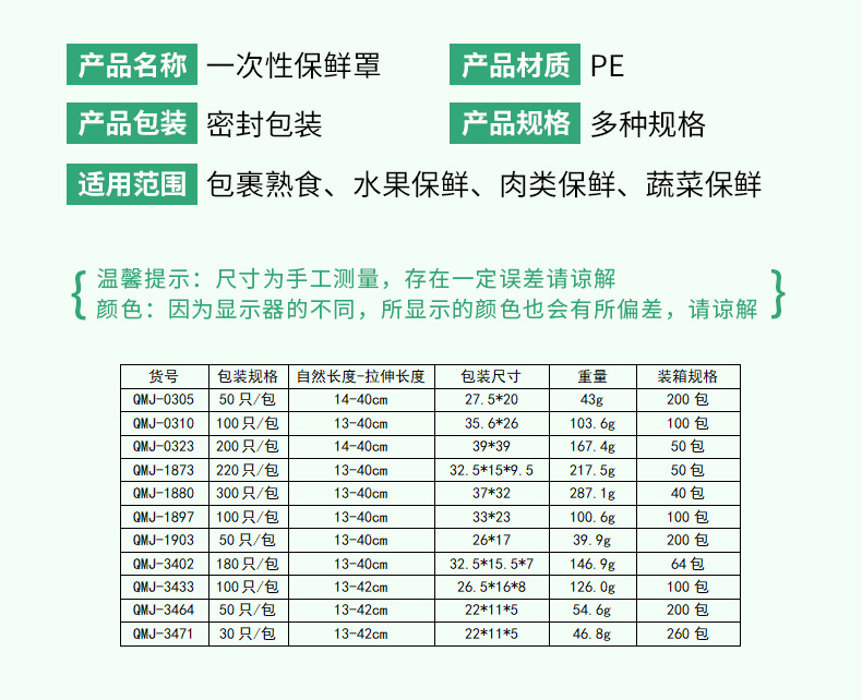 サイズ Qimeijie 1897 1 パックあたり 100 枚の鮮度保持カバー、1 箱あたり 100 パック