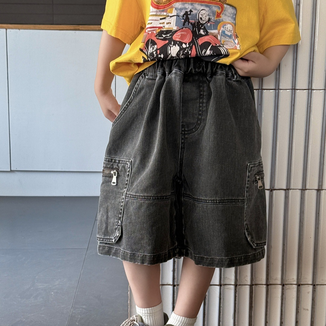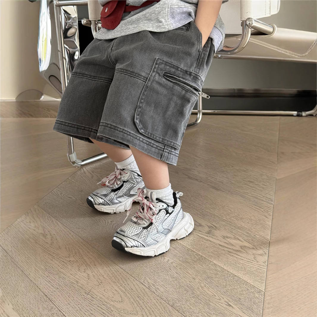2025 グリルド薄手子供用クールショーツ、レトロトレンディなワークウェア、大きな裾、ゆったりとした男の子のスタイリッシュなミッドパンツ