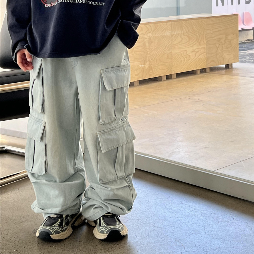 2025年秋新作子供用パンツ、子供用カーゴパンツ、韓国風シンプルでトレンディな多ポケットコットン製男女兼用カジュアルロングパンツ