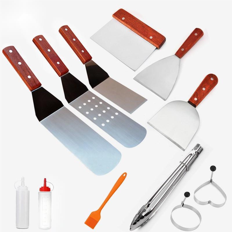 クロスボーダーアウトドアステンレス鋼バーベキューツールセットBBQグリルセット日本料理スパチュラ木製ハンドルフライパンスパチュラセット
