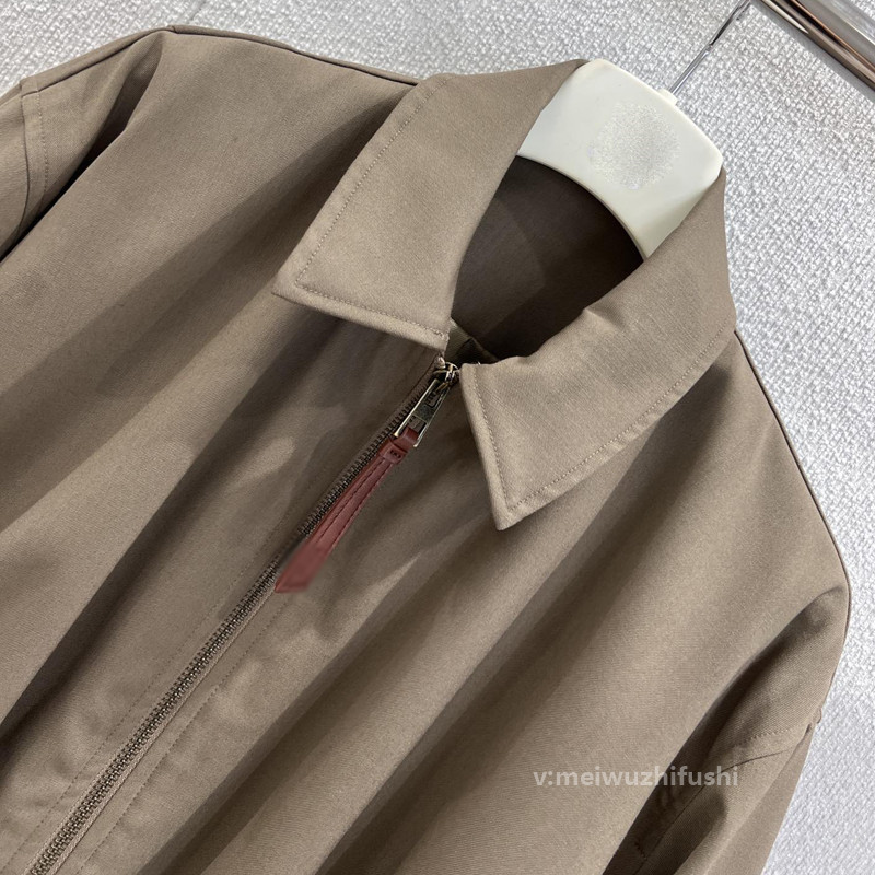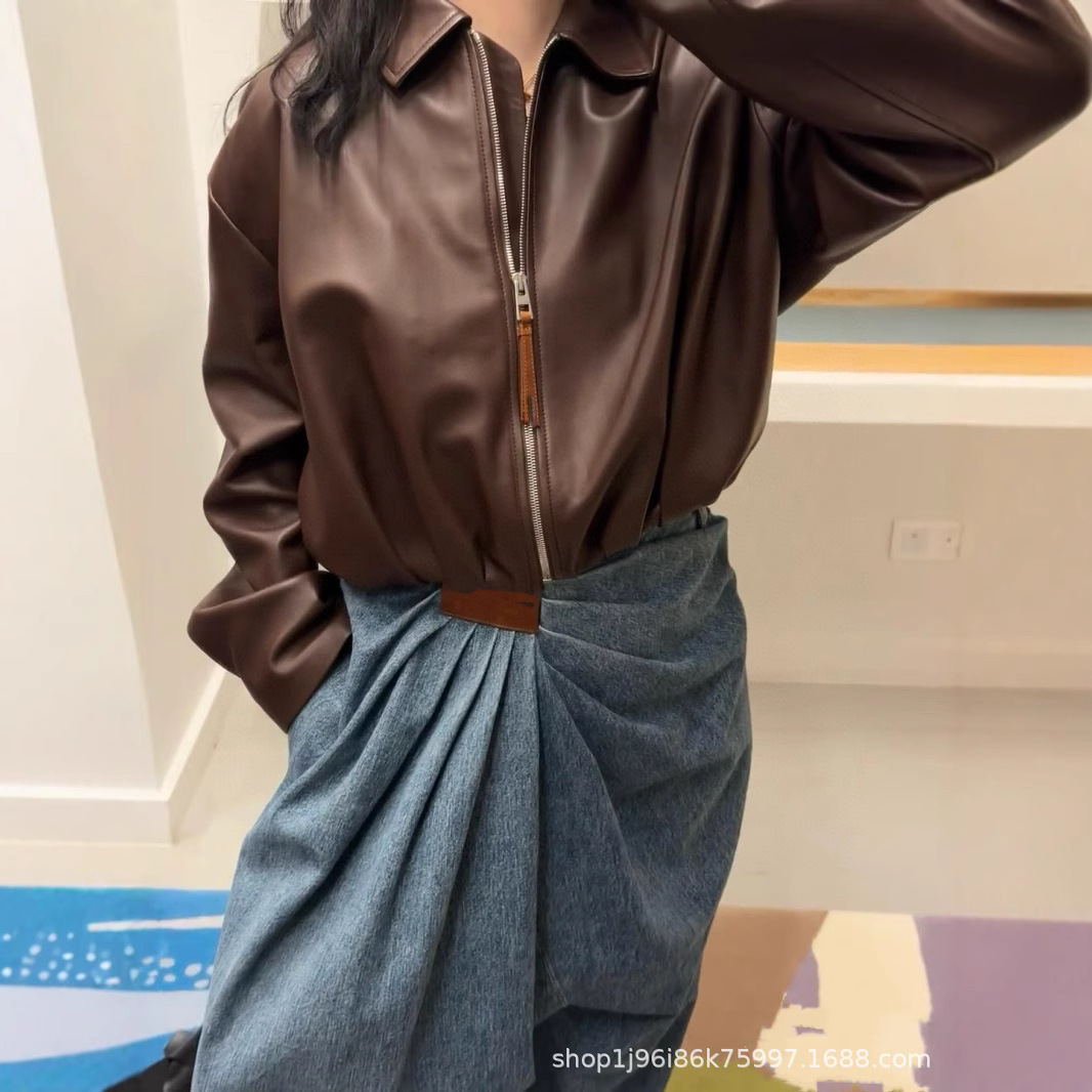 2025早秋灰棕色褶皱皮标翻领拉链夹克宽松显瘦减龄百搭上衣外套女
