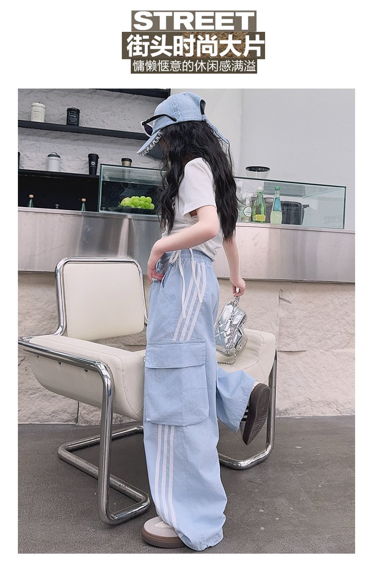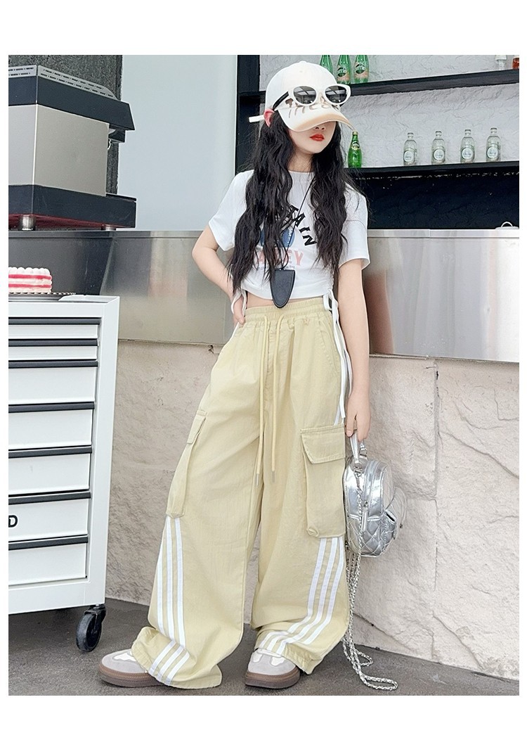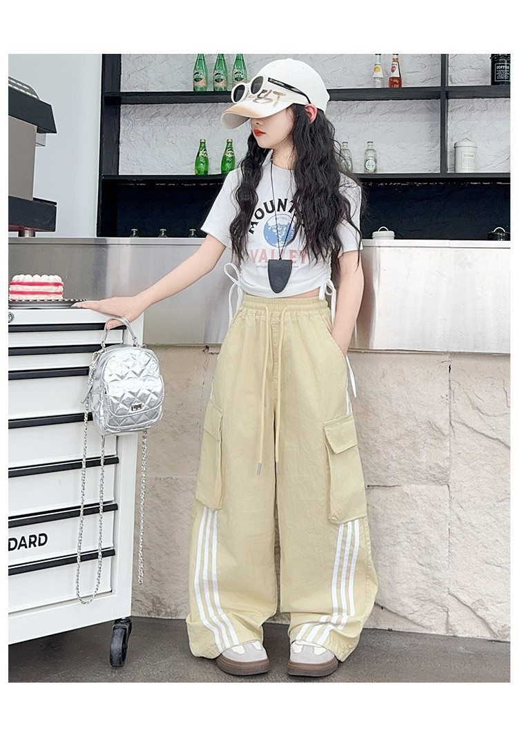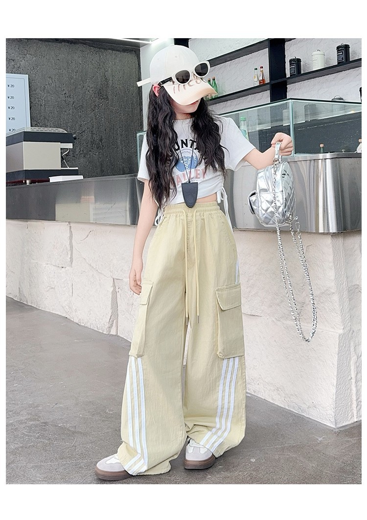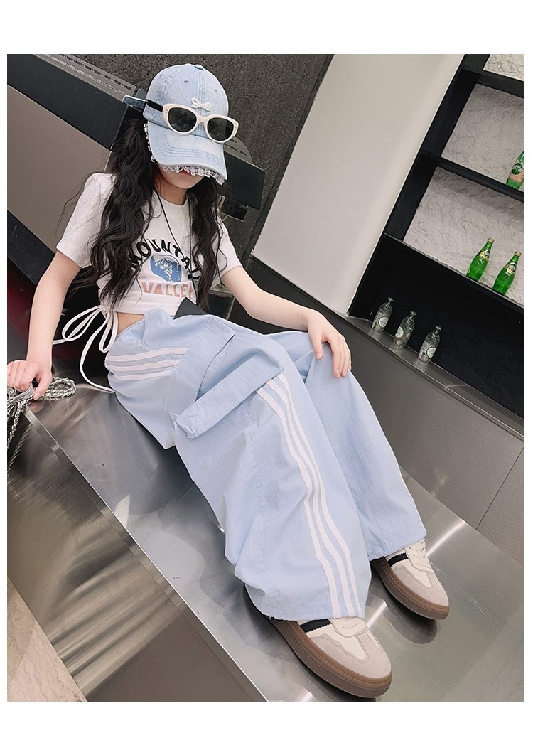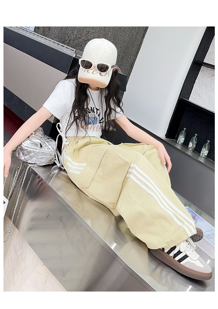 女の子作業服極薄夏ズボン2025新作子供カジュアルパンツ大きい子供ワイドレッグパンツ中学生速乾パンツ