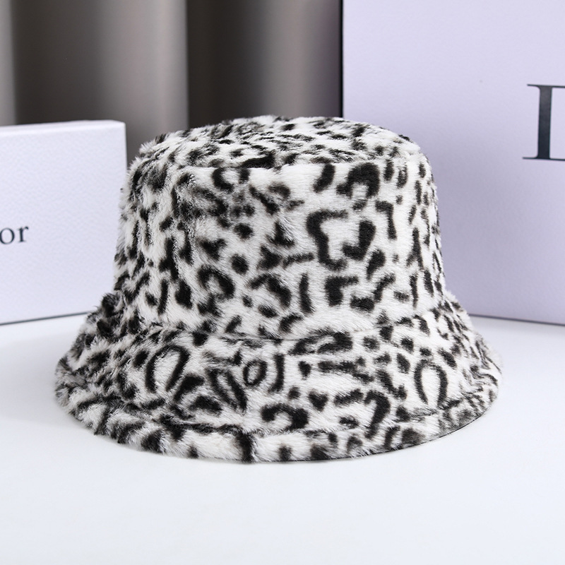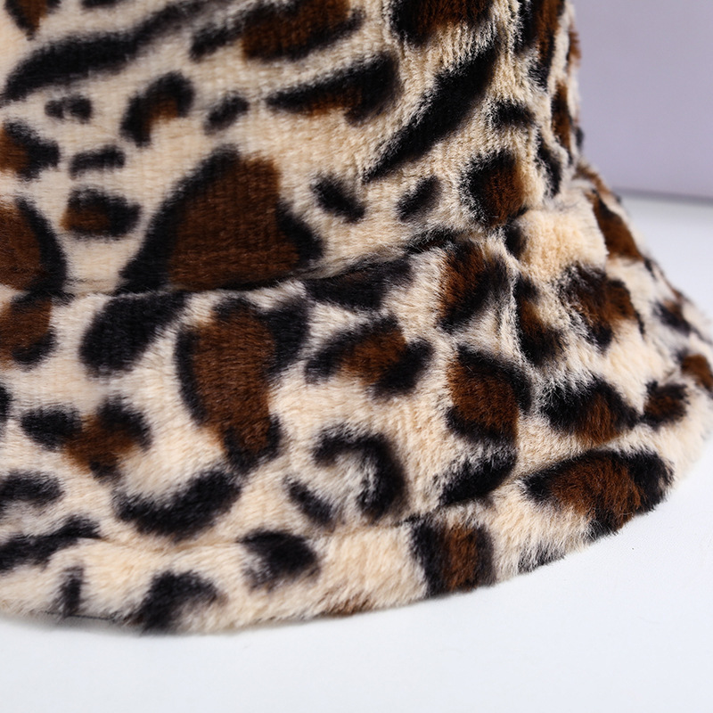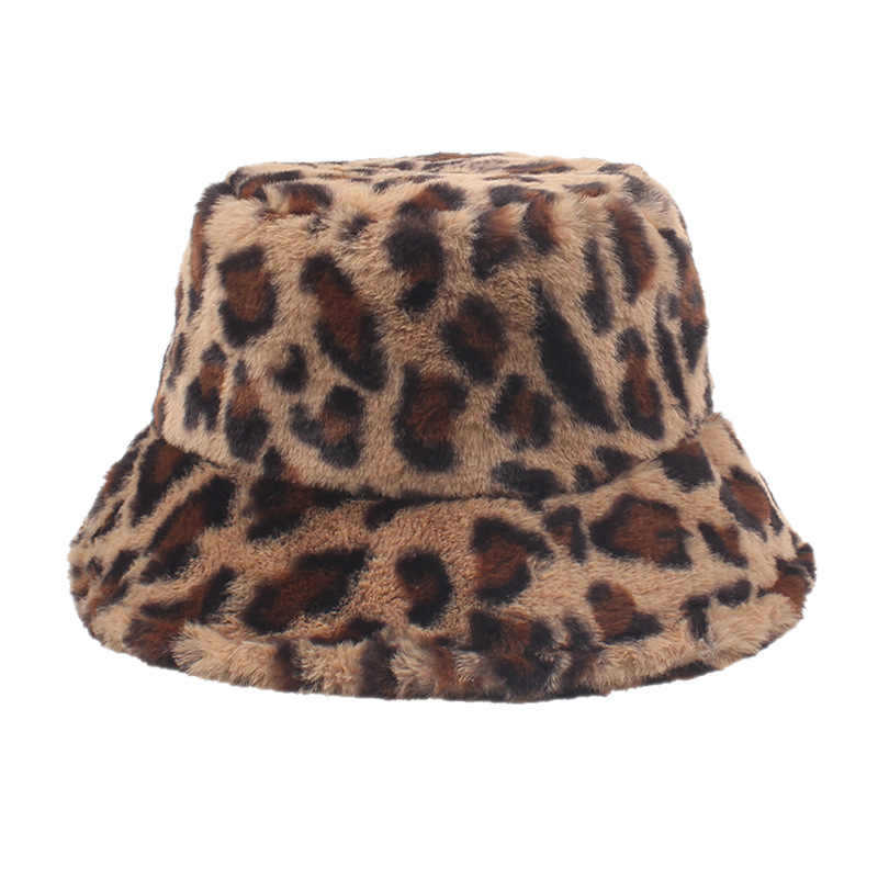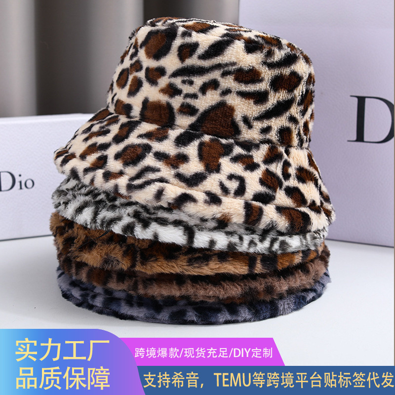 跨境帽子女冬季显脸小豹纹渔夫帽女百搭保暖盆帽ins毛绒水桶帽无