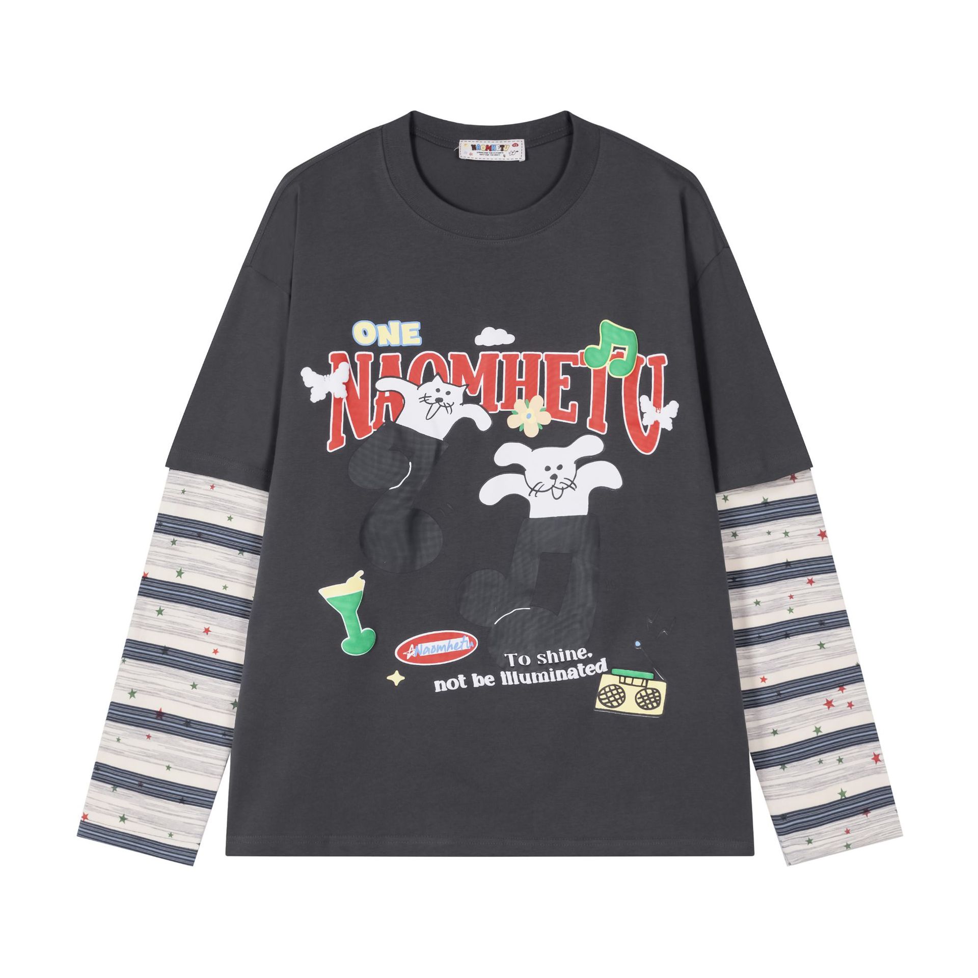 潮牌拼接发泡卡通印花长袖T恤男女秋季宽松休闲百搭假两件上衣
