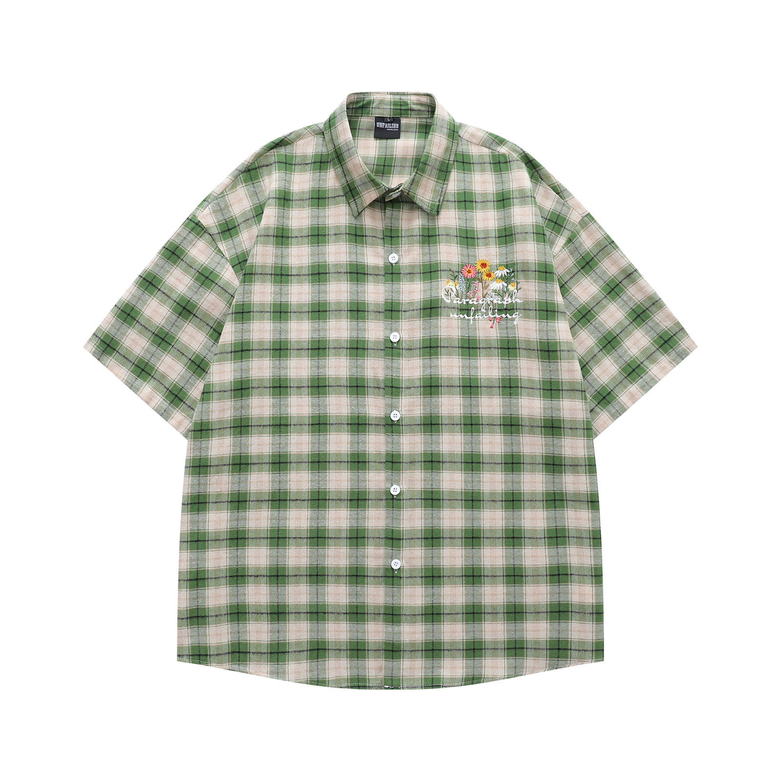 日系レトロ小鄒菊刺繍格子半袖シャツ
