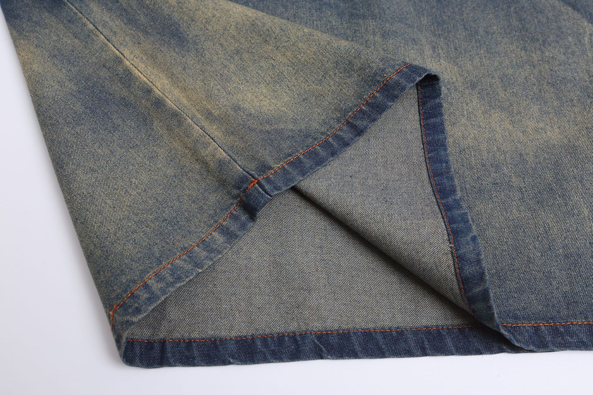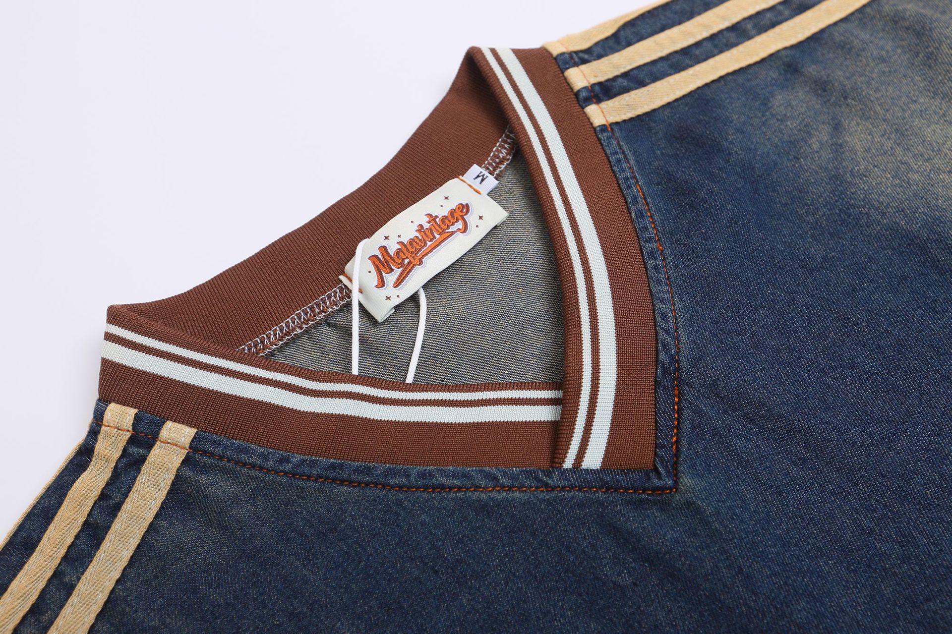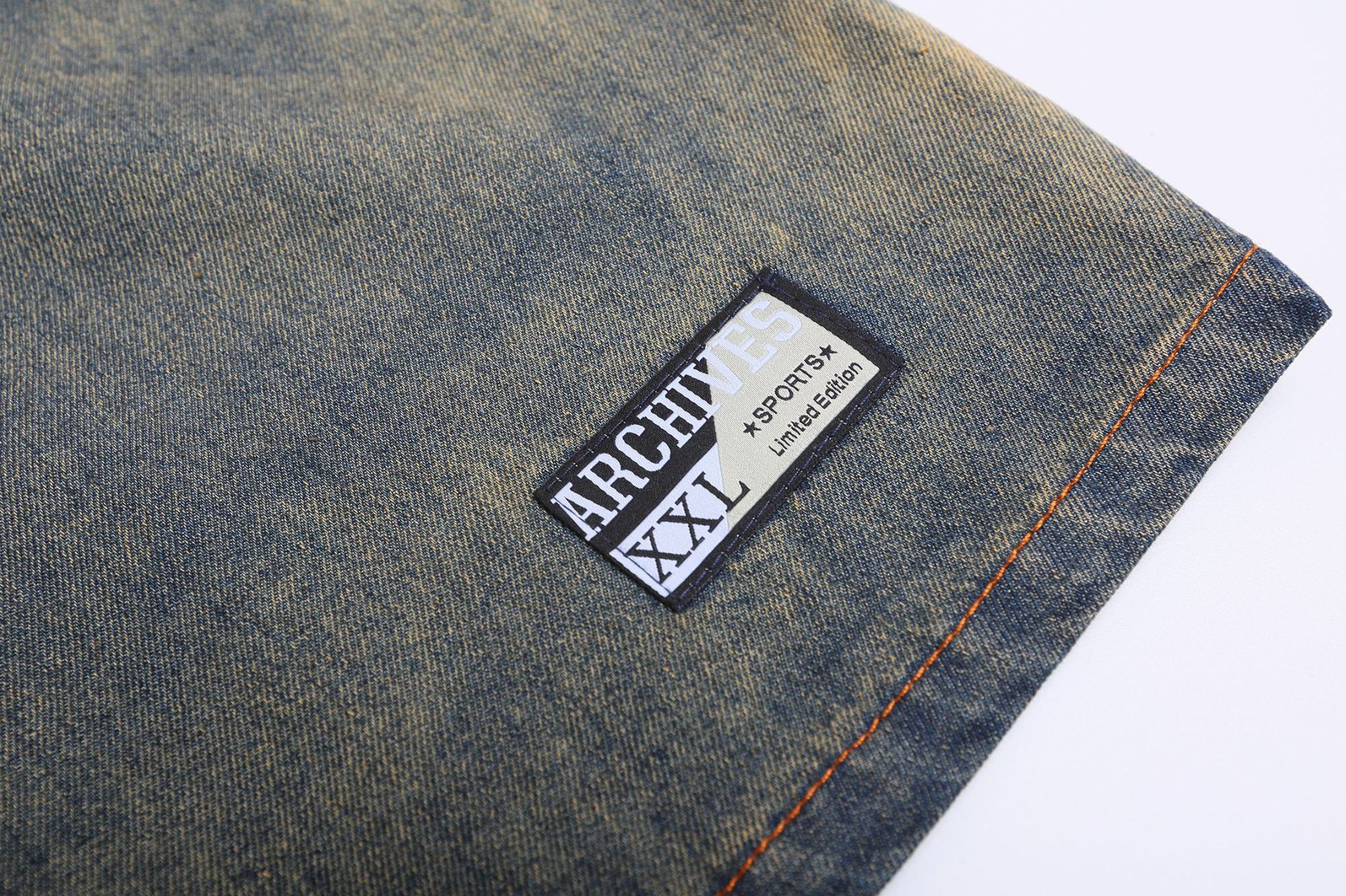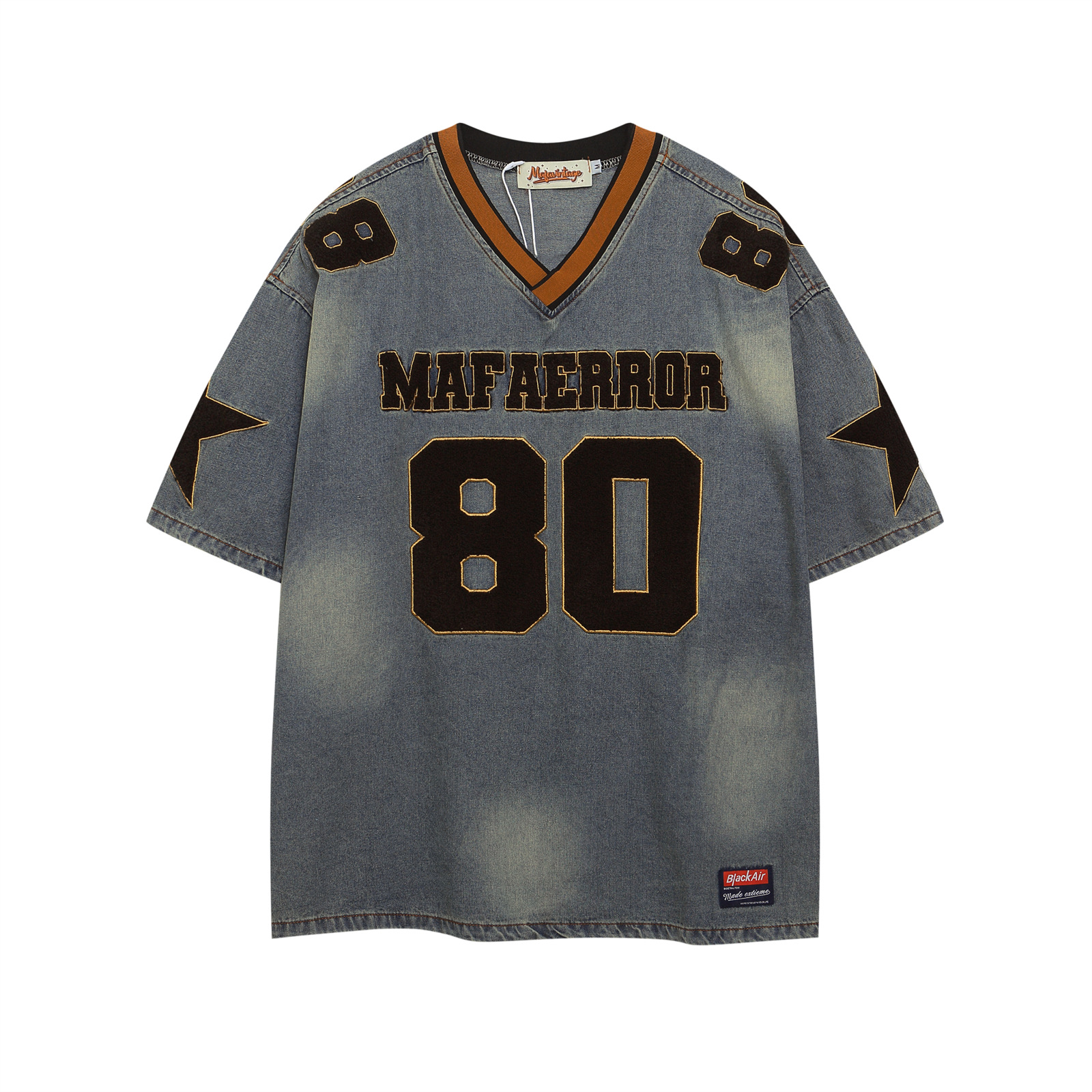 アメリカンレトロウォッシュ加工レター刺繍Vネックデニム半袖メンズ・レディースハイストリートハンサムデザインTシャツトップス