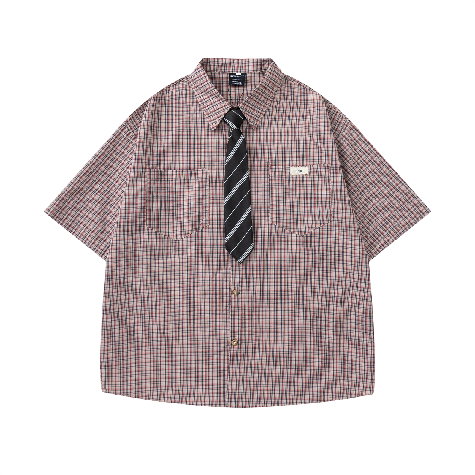 日本系レトロ格子ネクタイ半袖シャツ男性夏ファッショントレンドゆるいカジュアルカップルシャツ