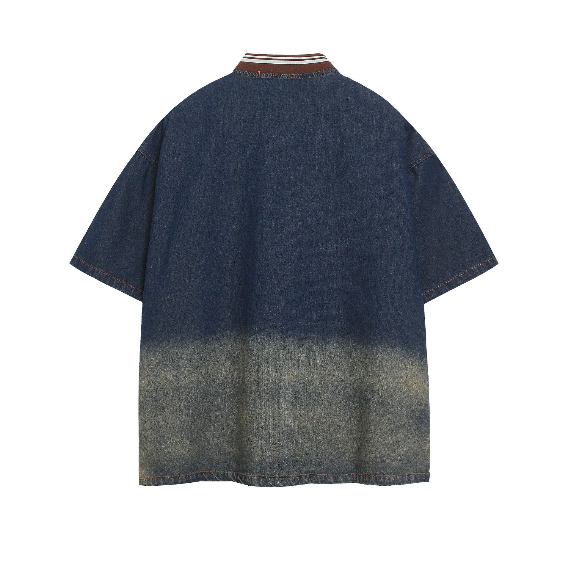 2025夏の新中国式スプライシング水洗いジャカード盤バックル小大衆デザイン感カジュアルデニム半袖シャツ男女