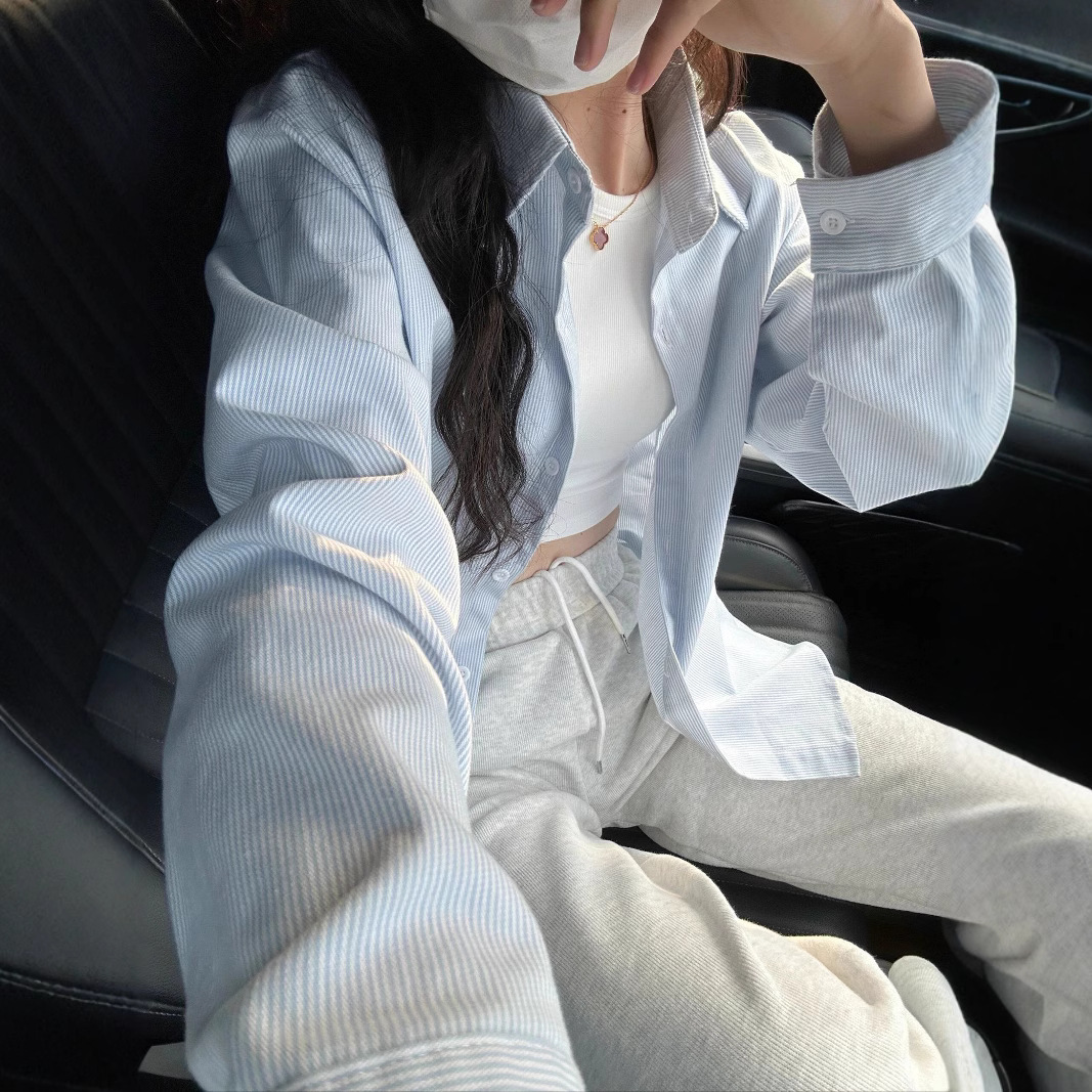 純綿のストライプのシャツのコートの女性の春の夏の2025新型の婦人服の日焼け止めのシャツのゆったりした長袖のカップルの上着