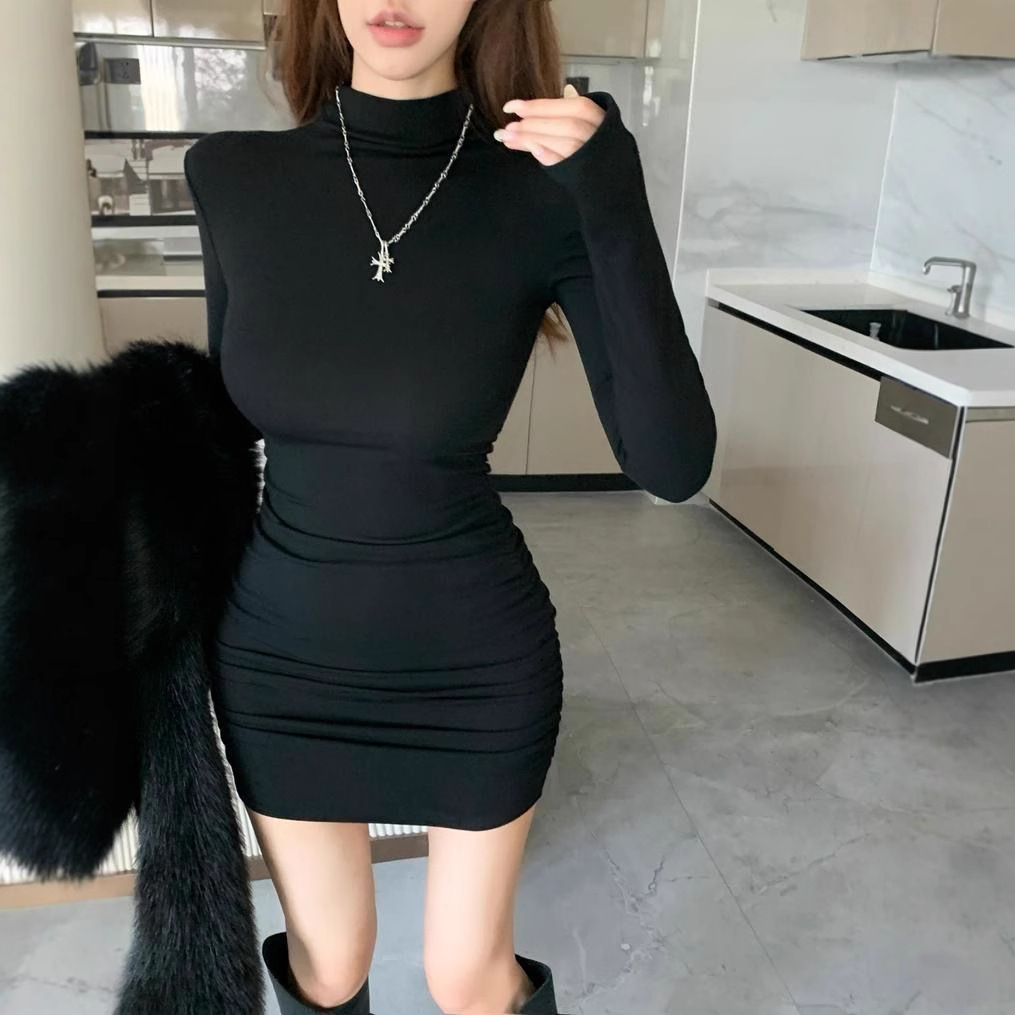ギャルの半高襟の長袖のワンピースの女性の秋冬の修身はヒップのスカートの中でベースのスカートの純粋な欲風の短いスカートを掛けます。