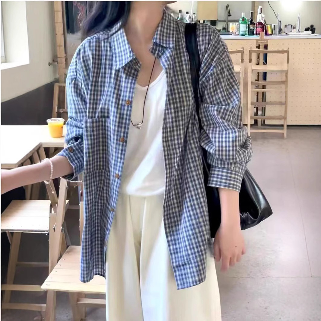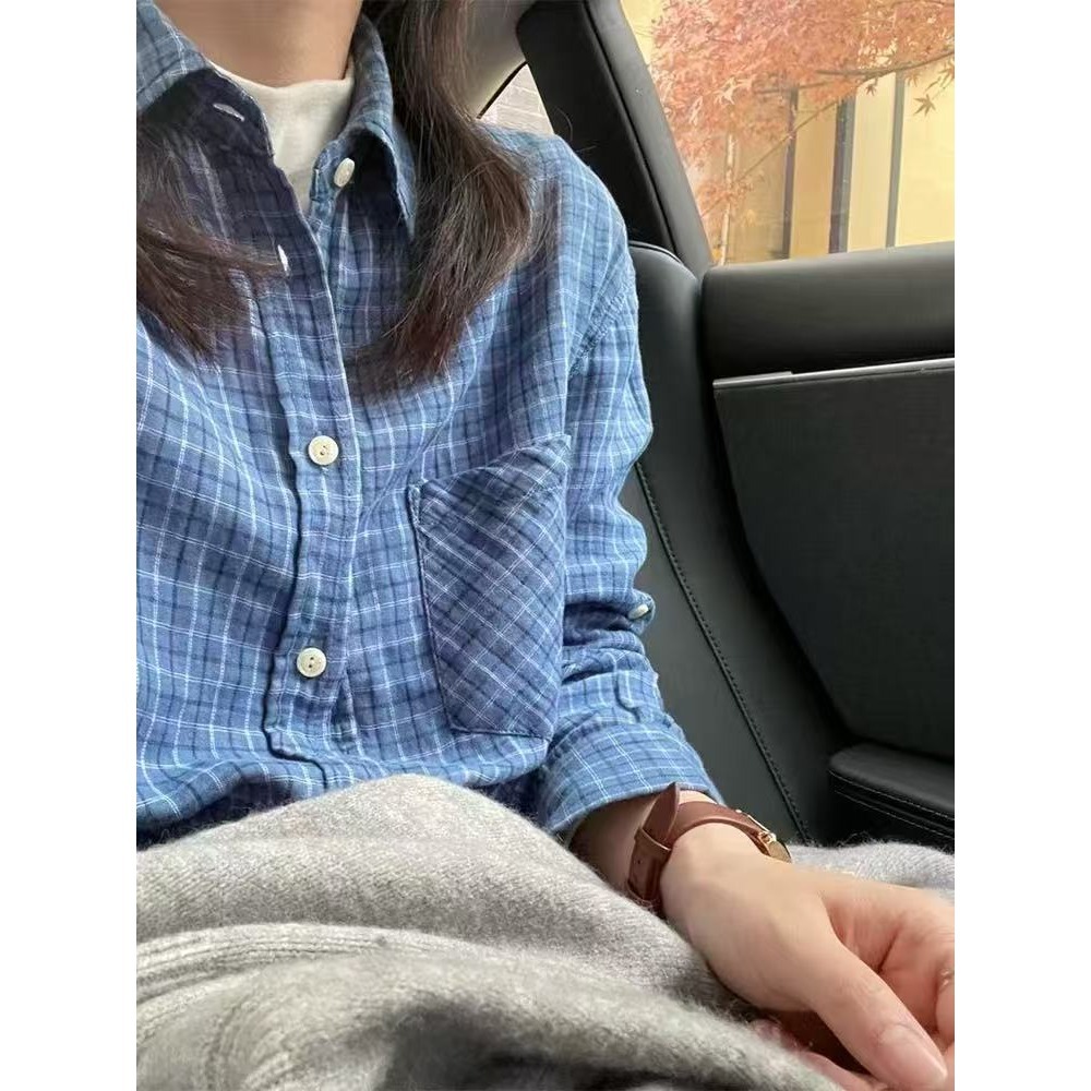 韩系蓝色小格纹翻领长袖衬衫女秋季2025新款慵懒宽松舒适外搭上衣