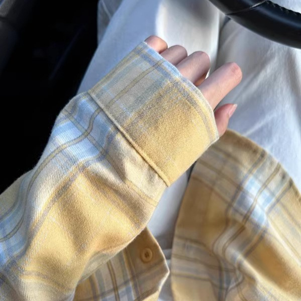 雰囲気感のあるミルク黄色の純綿の格子のシャツの小さい子供の春秋のシャツの怠惰な中で長袖の上着の女性の卸売りに乗ります。