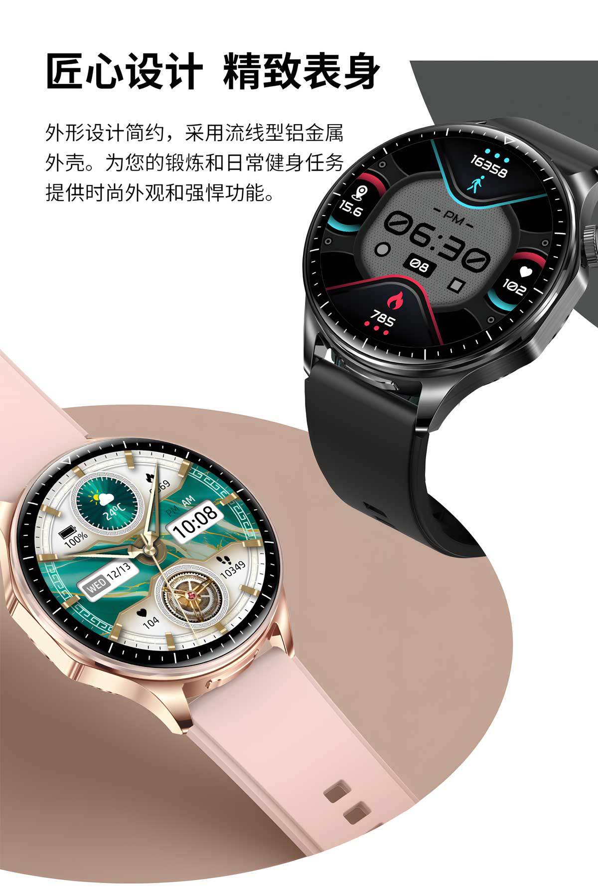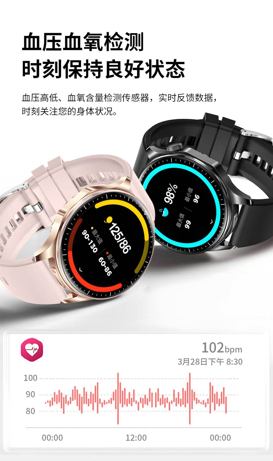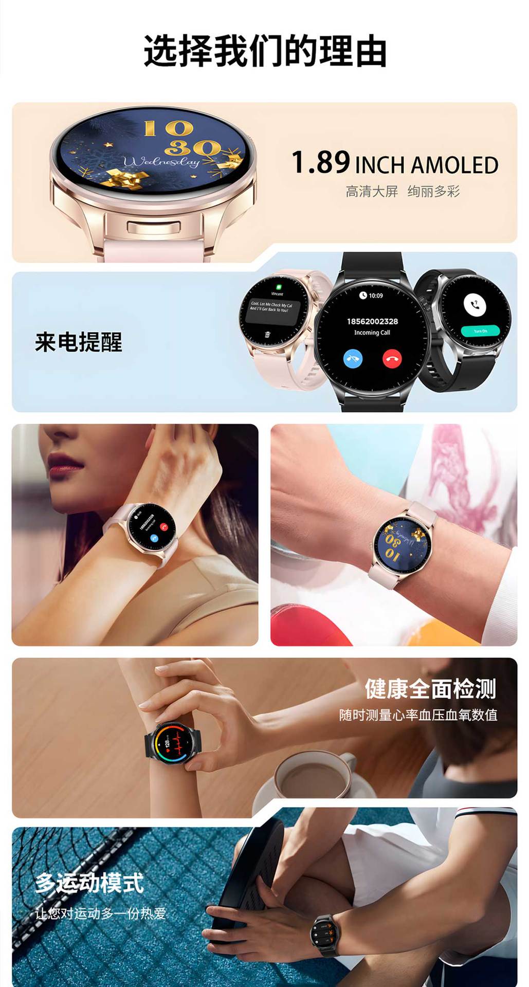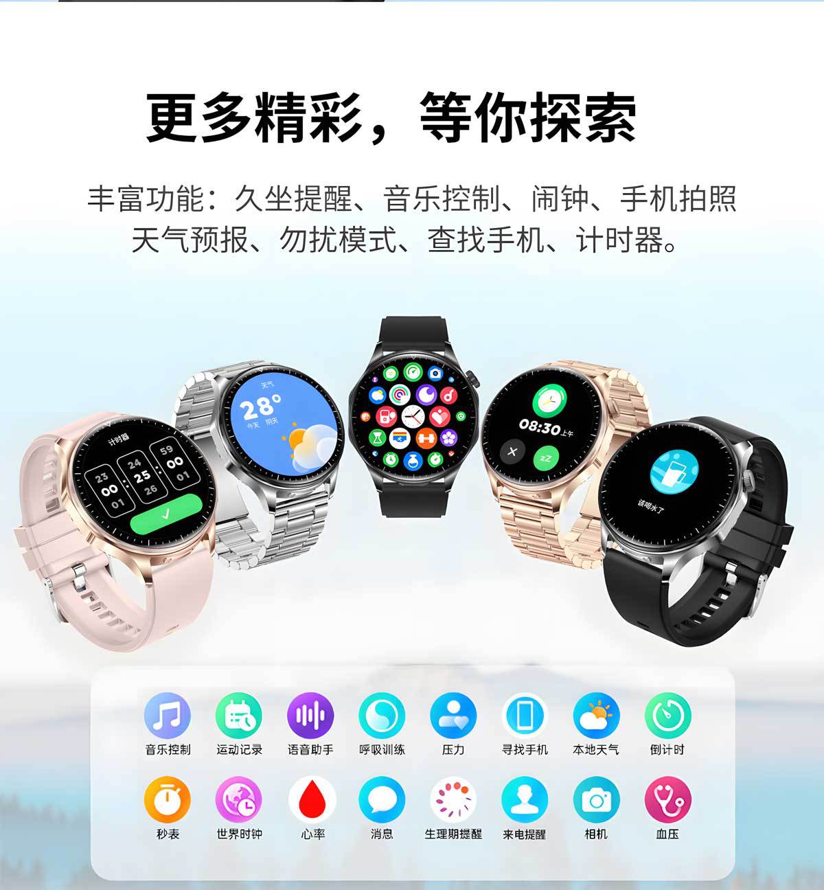 功能 计步,心率监测,血压测量,社交娱乐,蓝牙通话,NFC功能,智能提醒,遥控自拍,睡眠监测,血氧检测