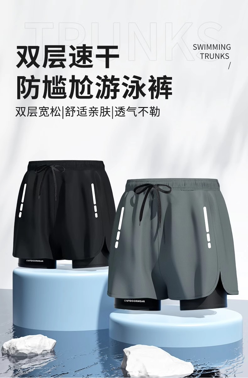クロスボーダー水泳パンツ男性ゆるい気まずい二重水泳パンツ男性ランニングスポーツパンツ通気速乾温泉水泳パンツ