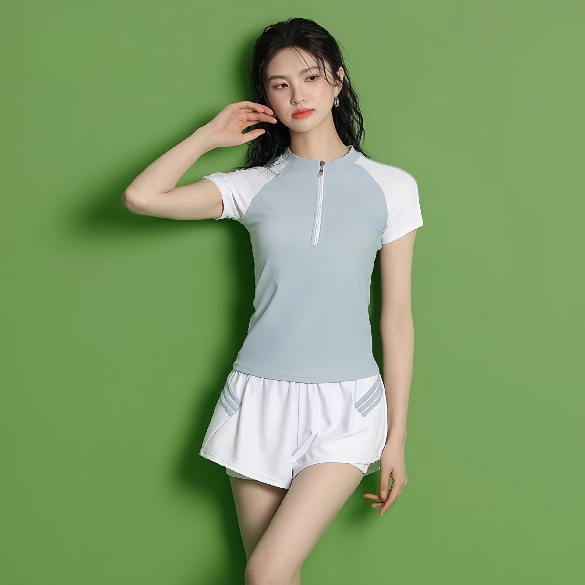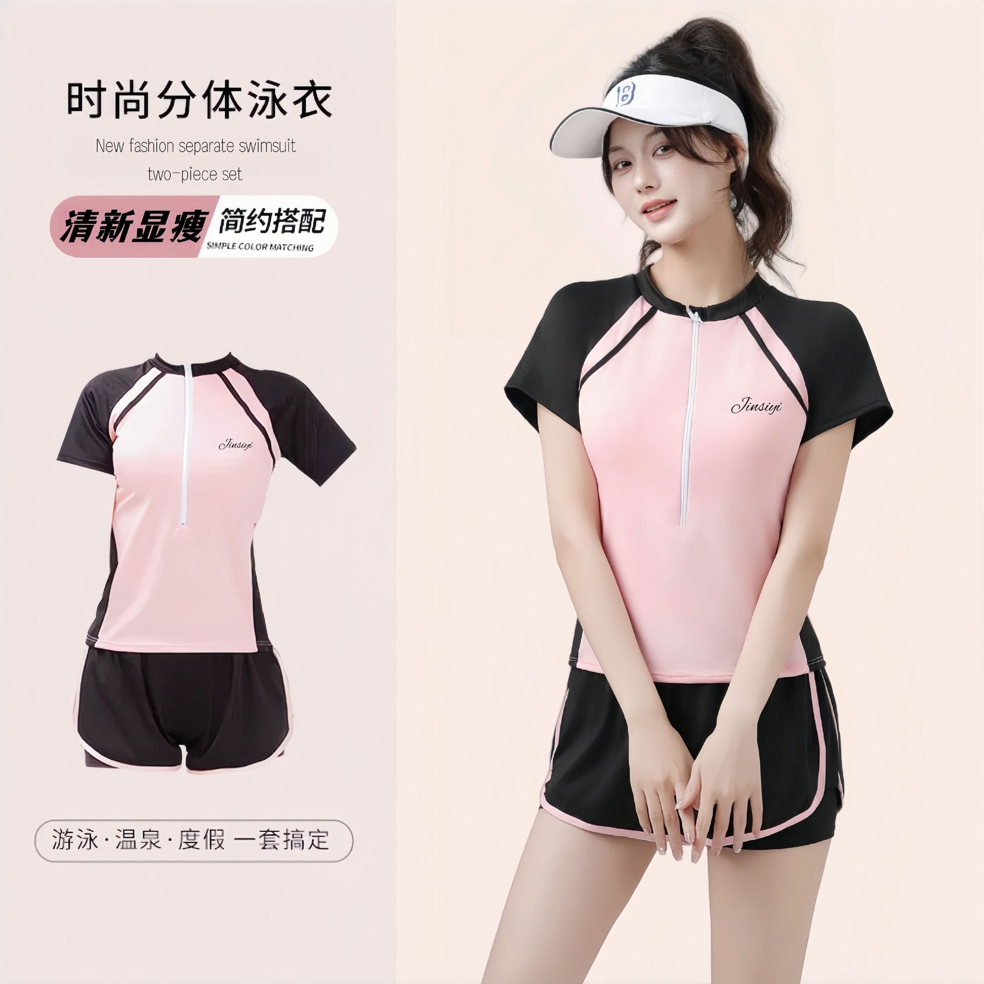 水着の女性の新型の分体運動の半袖の2つのセットは保守的でやせている温泉の学生の水泳館の温泉の水着です。