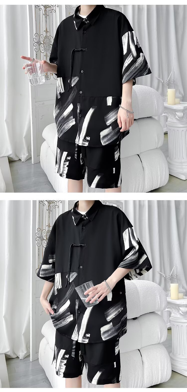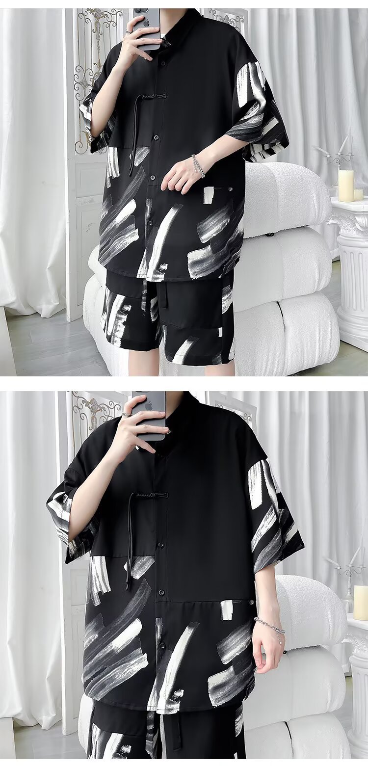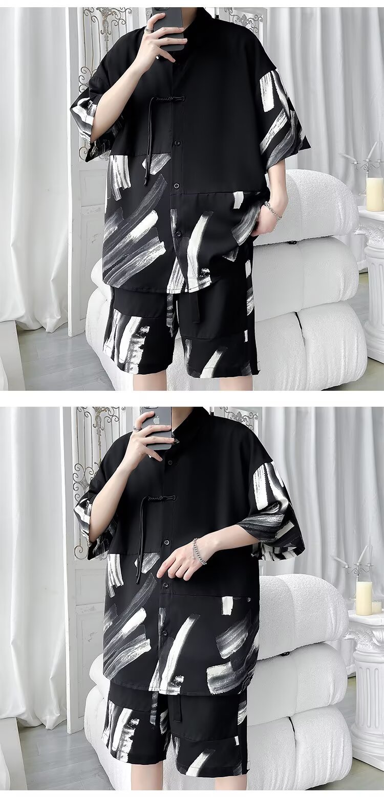 Piushuai タイダイアイスシルクスーツメンズ夏薄い中国風スプライシング半袖ショーツ新しい中国風のツーピースセット
