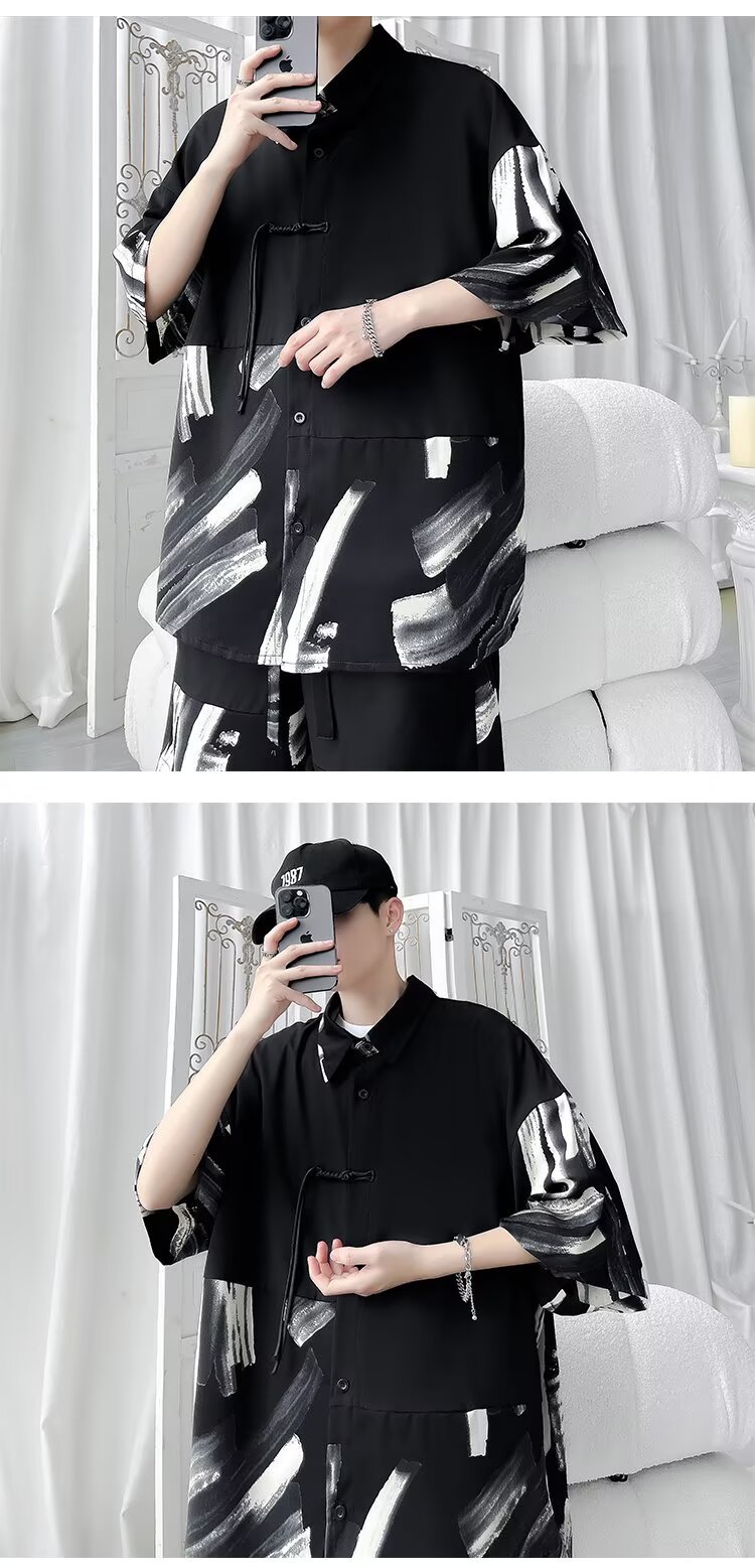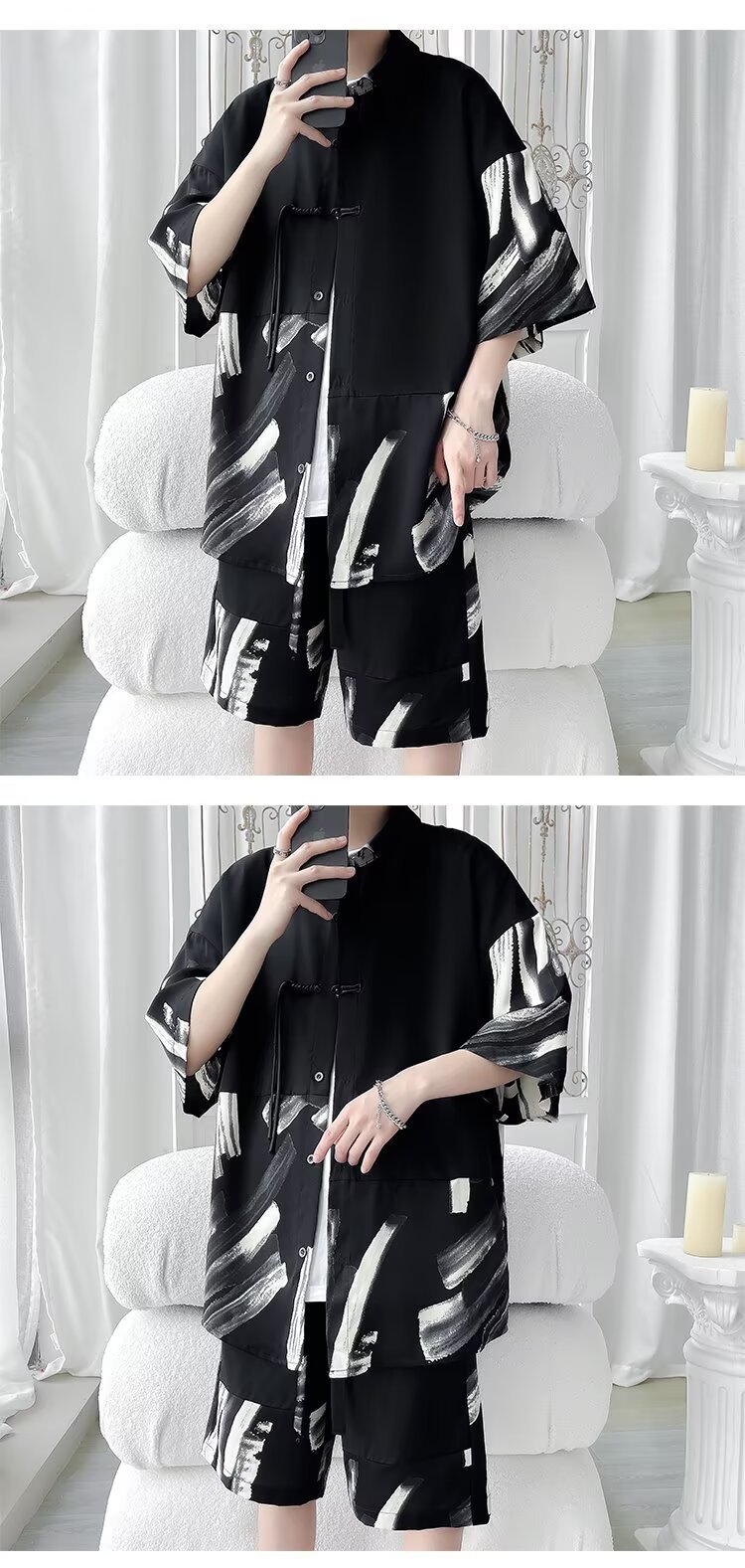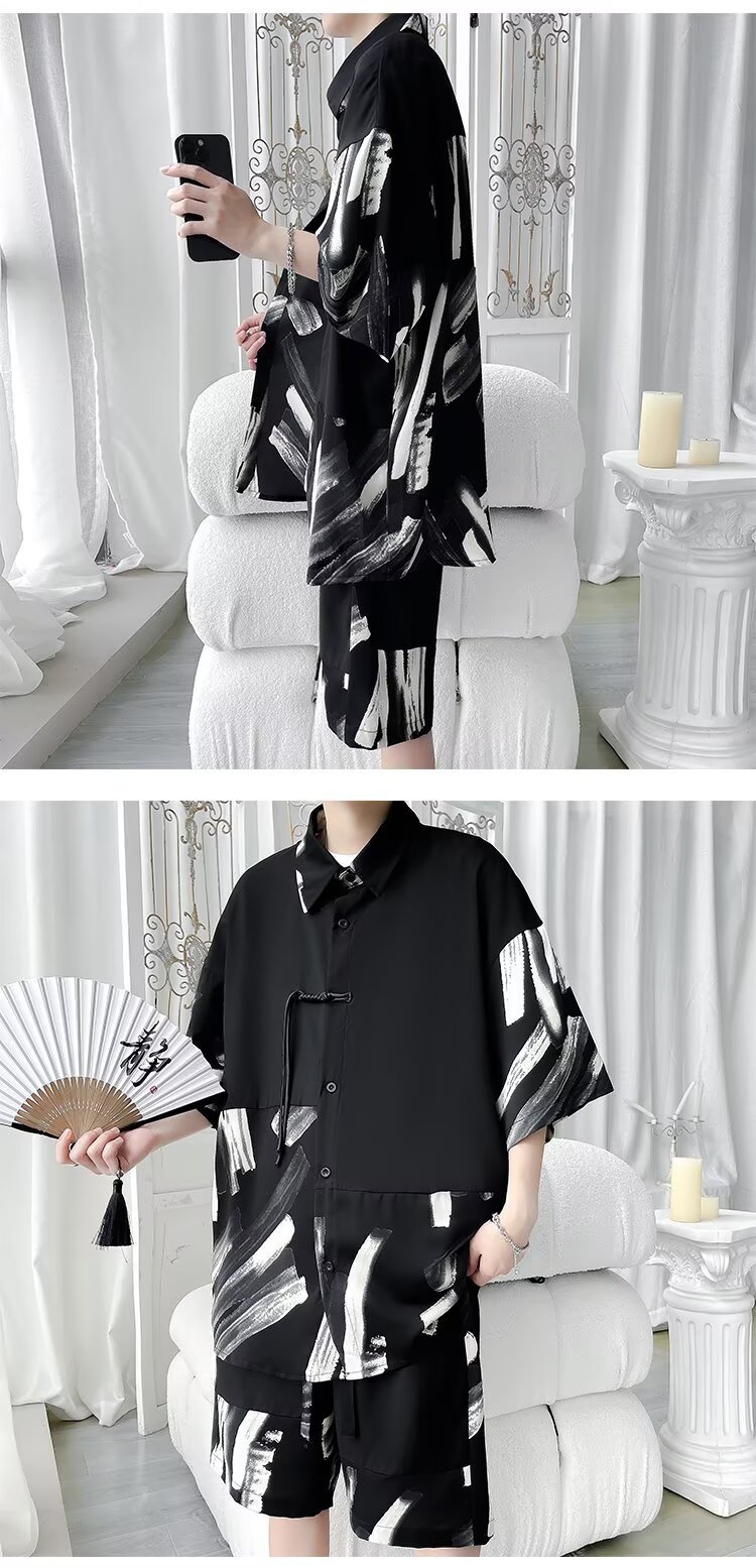 Piushuai タイダイアイスシルクスーツメンズ夏薄い中国風スプライシング半袖ショーツ新しい中国風のツーピースセット