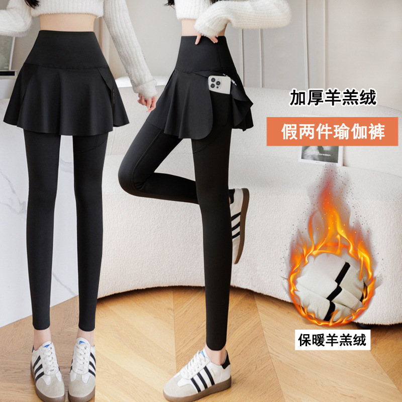 羊羔绒加厚假两件裙裤秋冬高腰口袋鲨鱼裤外穿保暖显瘦大码打底裤