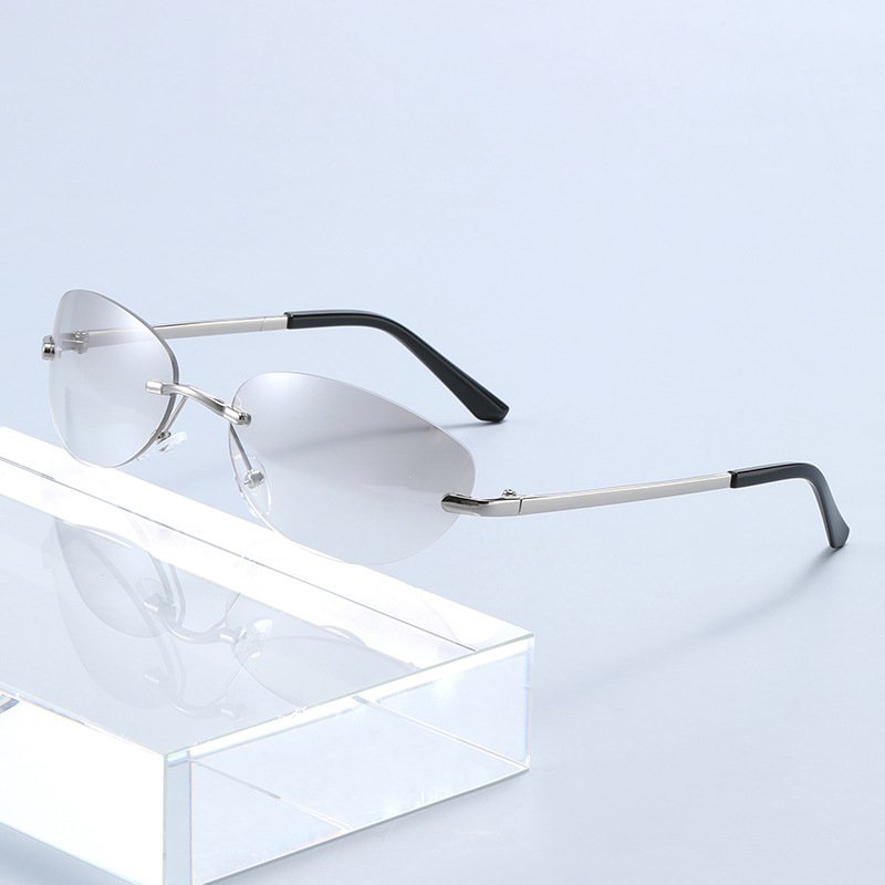 无框墨镜黑色金属镜腿深邃灰弧面镜片防紫外线摩登轻盈太阳镜眼镜