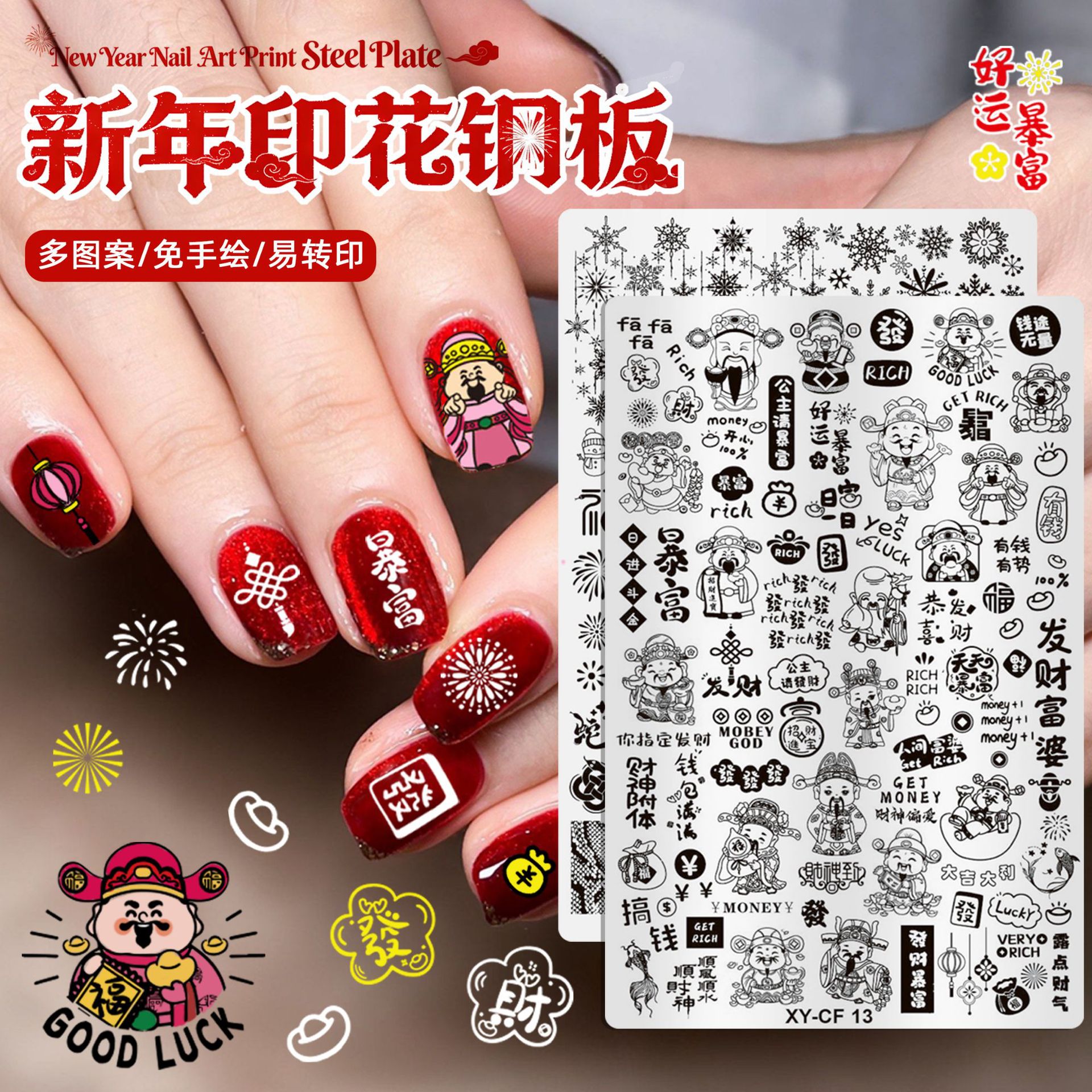新年系列美甲印花钢板雪花财神马年暴富烟花图案指甲转印模板工具