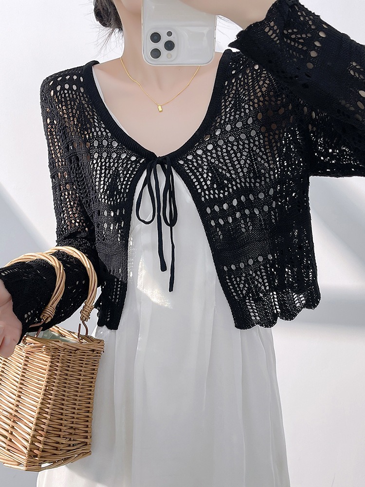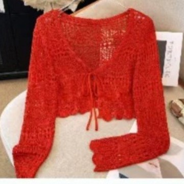 2025夏の新型の薄いスタイルのvネックのエアコンのブラウスの透かし彫りのニットの婦人服