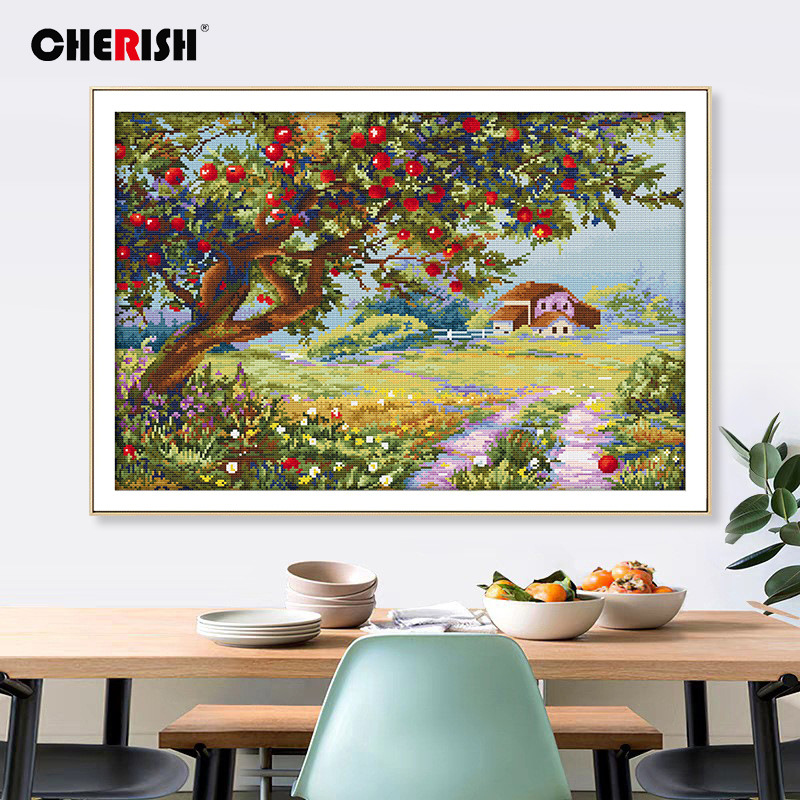 十字刺繍を大切にする新型2025年に爆発したリンゴの木の油化風景客間寝室の手作りdiy刺繍