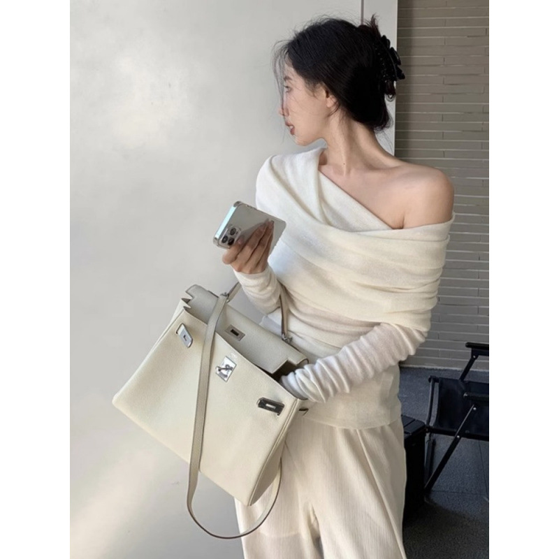 ワンショルダーセーター レディース 2025年新作 シンプルでセクシーな大襟 オフショルダー 優しい雰囲気 長袖ニット 秋冬