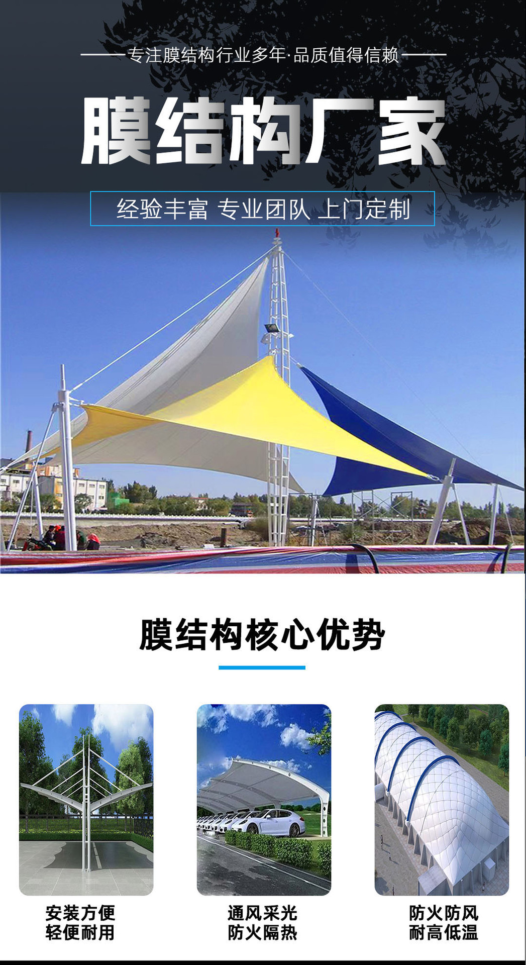 华台膜结构生产厂家,专业团队承接膜结构工程,停车棚、景观棚、体育看台蓬、铝合金车棚、推拉棚等,免费出设计图纸,全国可上门安装。