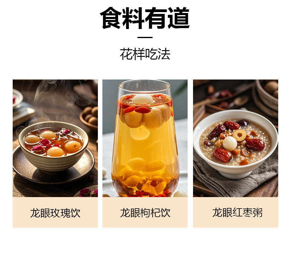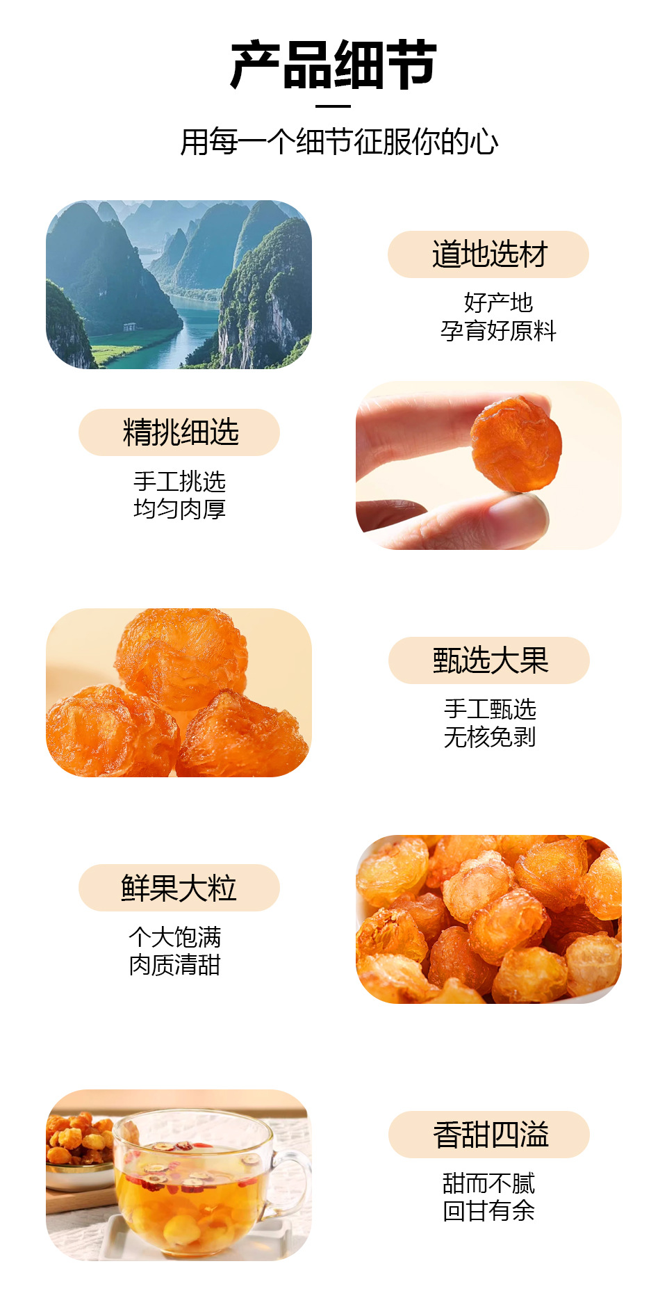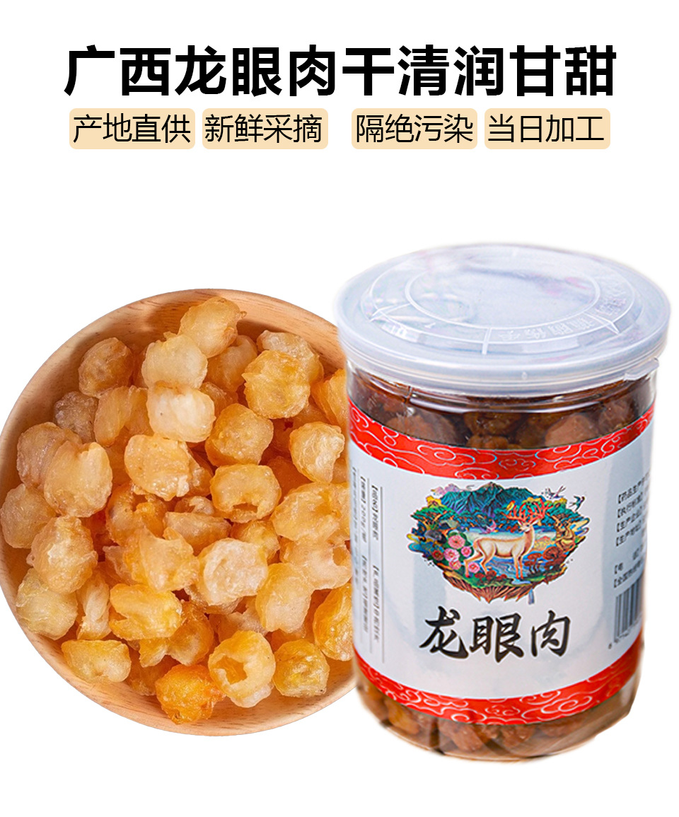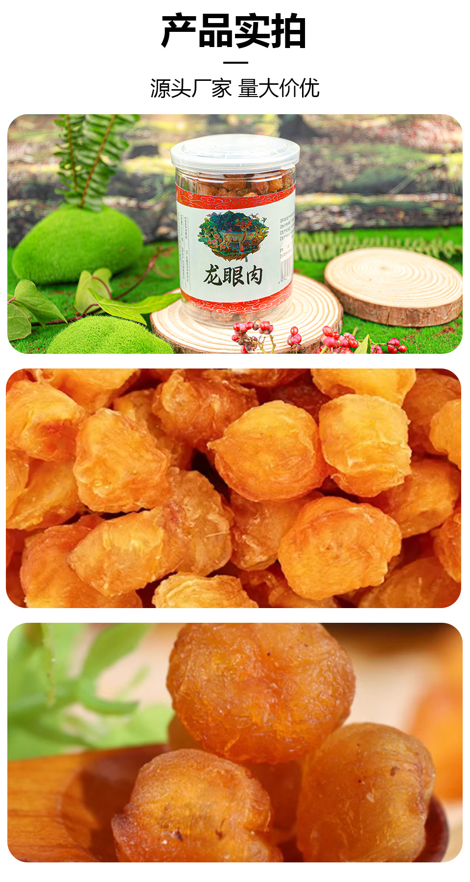 龍眼、乾燥龍眼、種なし200g、水に浸して赤いナツメヤシの実と厚い龍眼の肉を添えます