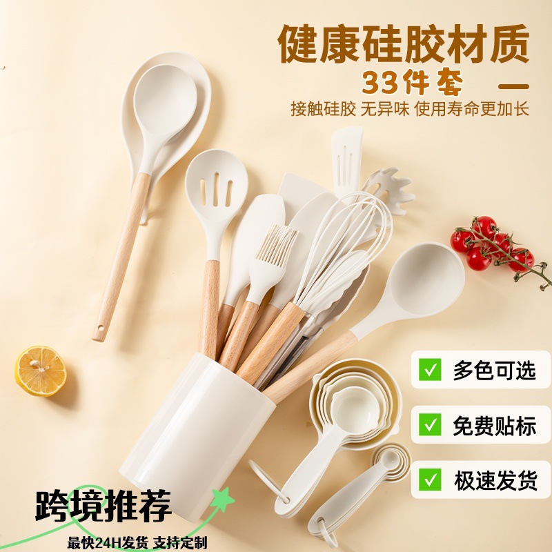 シリコンキッチン用品セット木製ハンドルスパチュラ調理スパチュラ収納バケツ計量カップ33点セットノンスティックキッチン用品セット