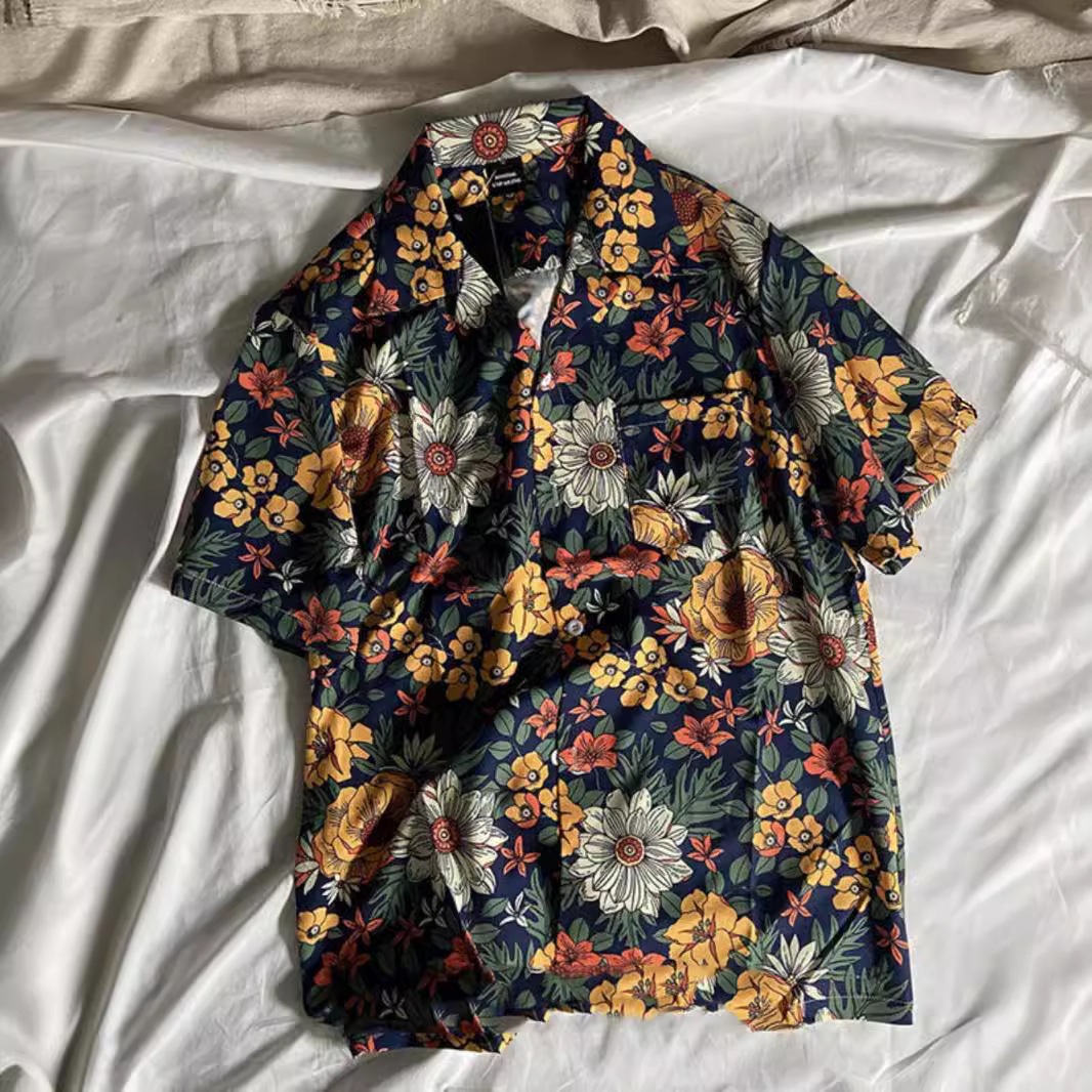 花柄プリント半袖花柄シャツ男性と女性用ハワイアンシーサイドヴィンテージシャツ日本の少年レトロルーズトップ