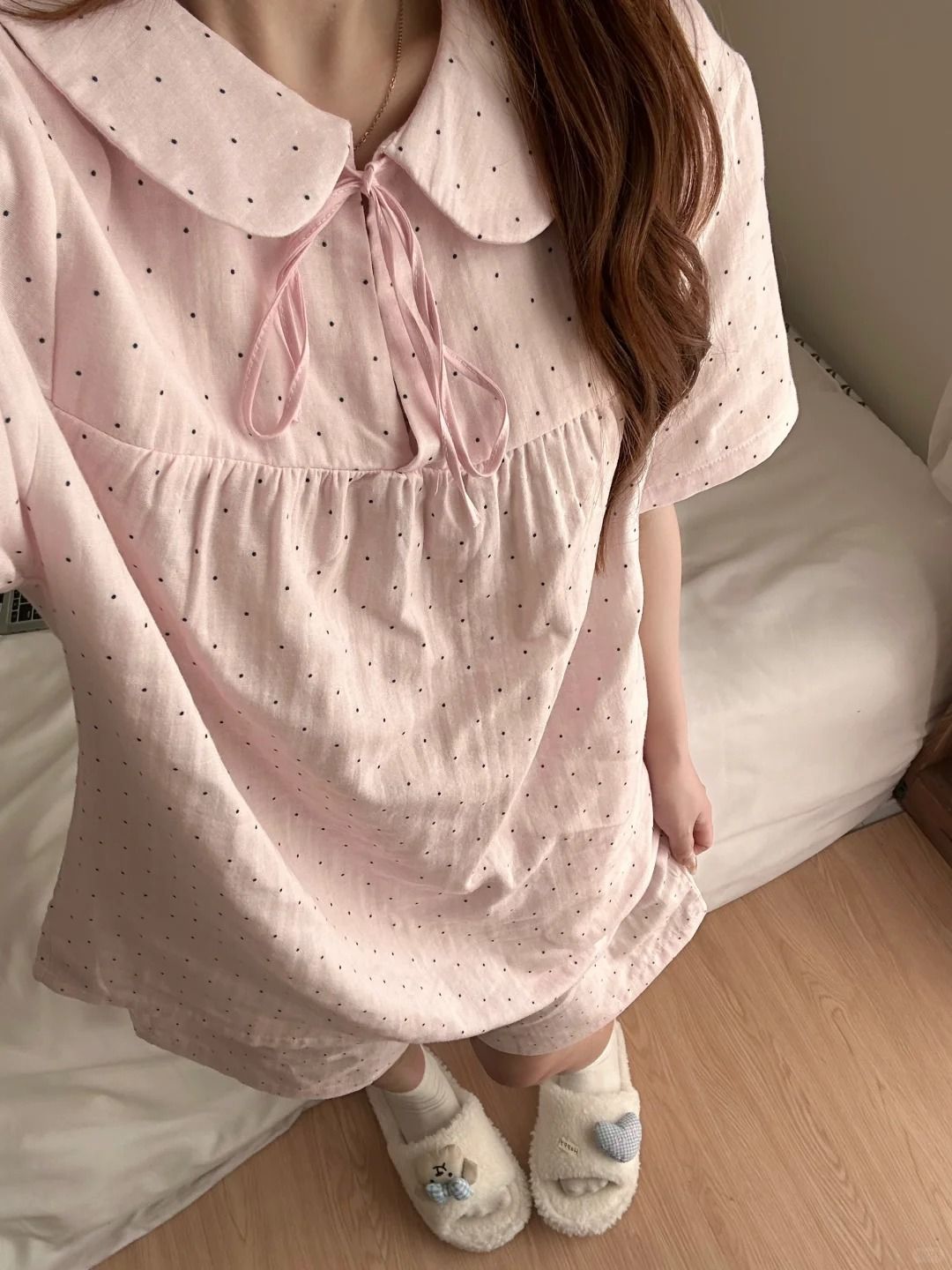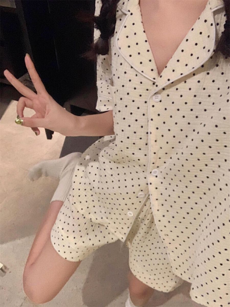 春と秋の女性用クロスボーダー貿易ラペルパジャマ、長袖ズボン、黒い点の漫画の女の子のホーム服、卸売かわいい