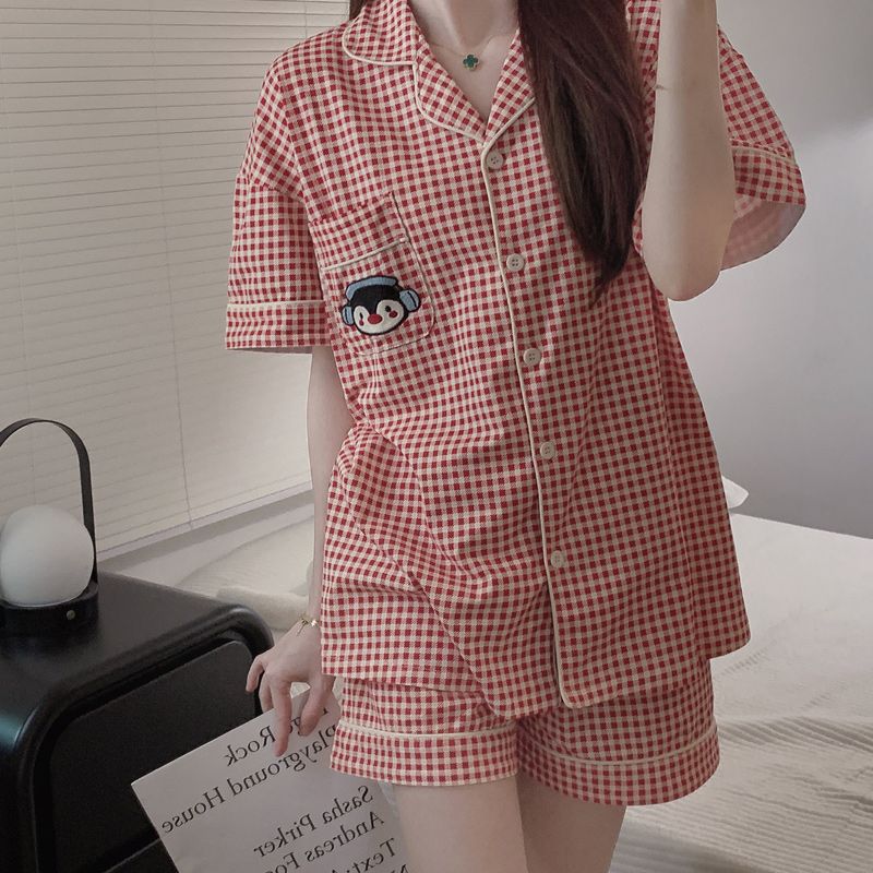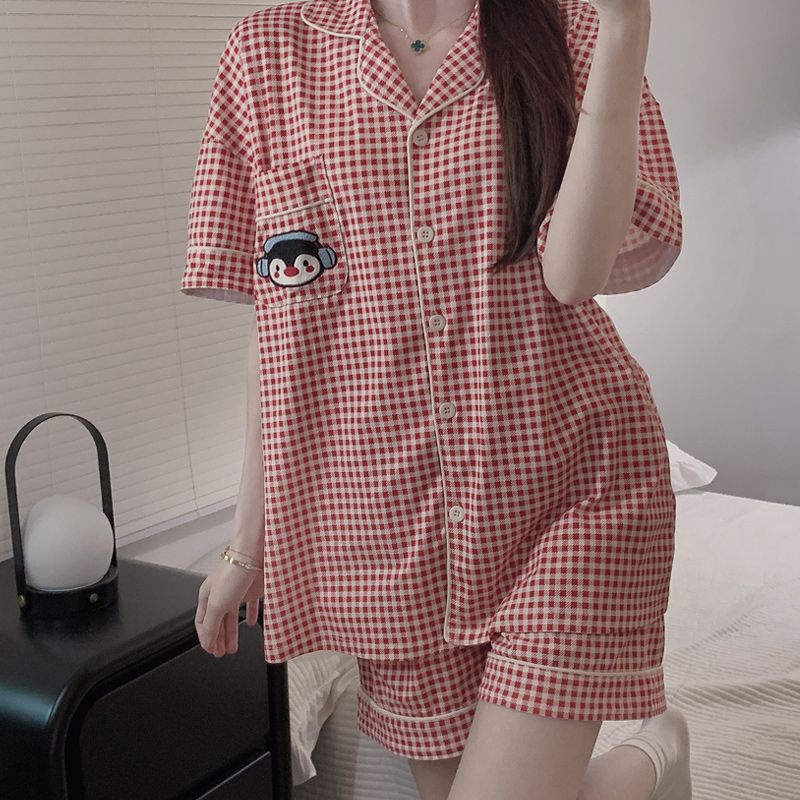 2025新型漫画ペンギンパジャマ女性夏半袖薄いモデルかわいいゆるい格子学生部屋服セット
