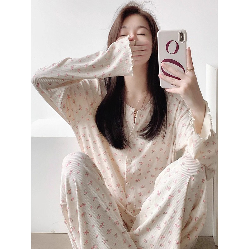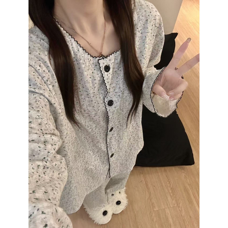 韩系碎花睡衣女春秋季长袖长裤甜美开衫可外穿家居服套装跨境批发