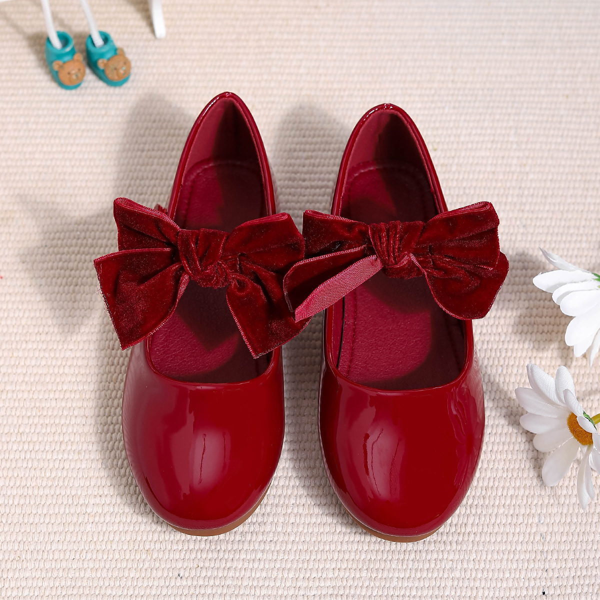 女の子用シングルシューズ、蝶結び付き漆皮パフォーマンスフラットシューズ、小革靴