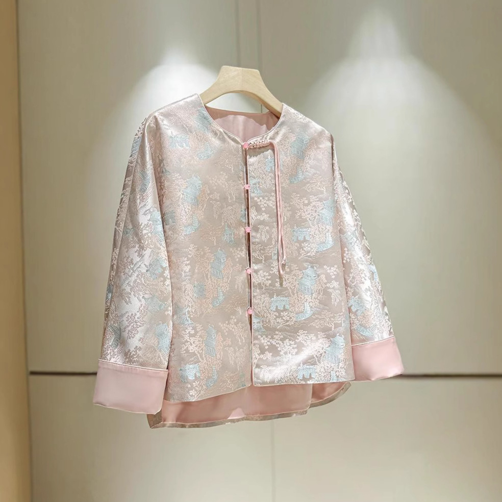 Ohs 5007新中国式ピンクジャカード女性2025新型国風気質レトロ唐装ベスト上着