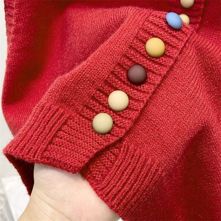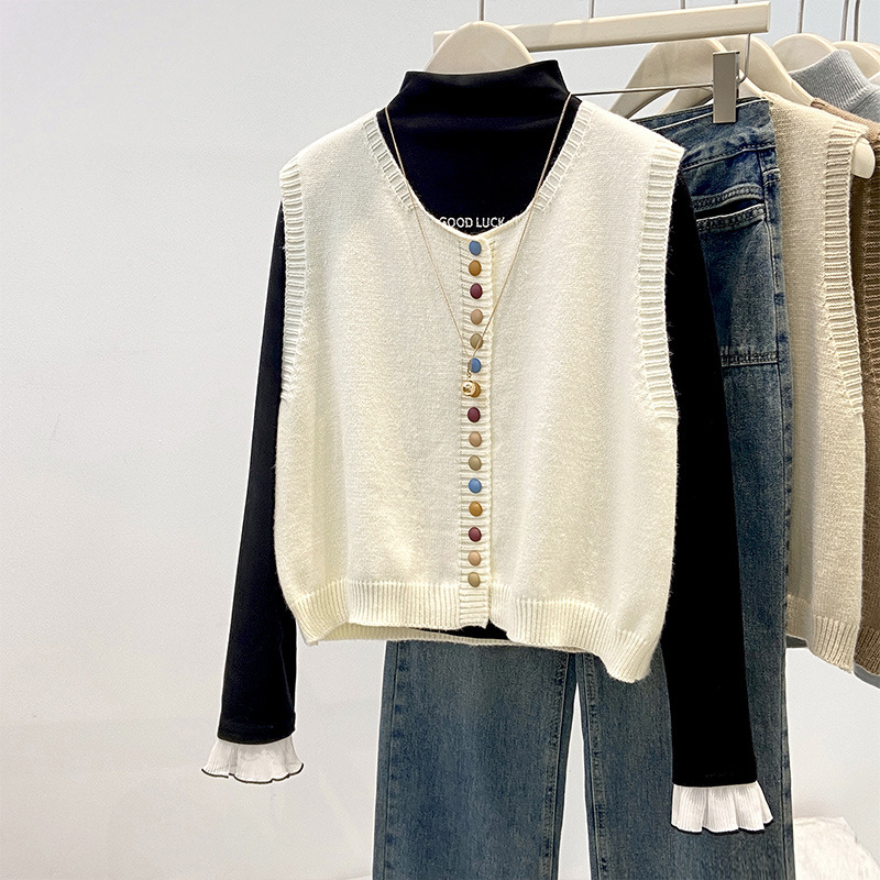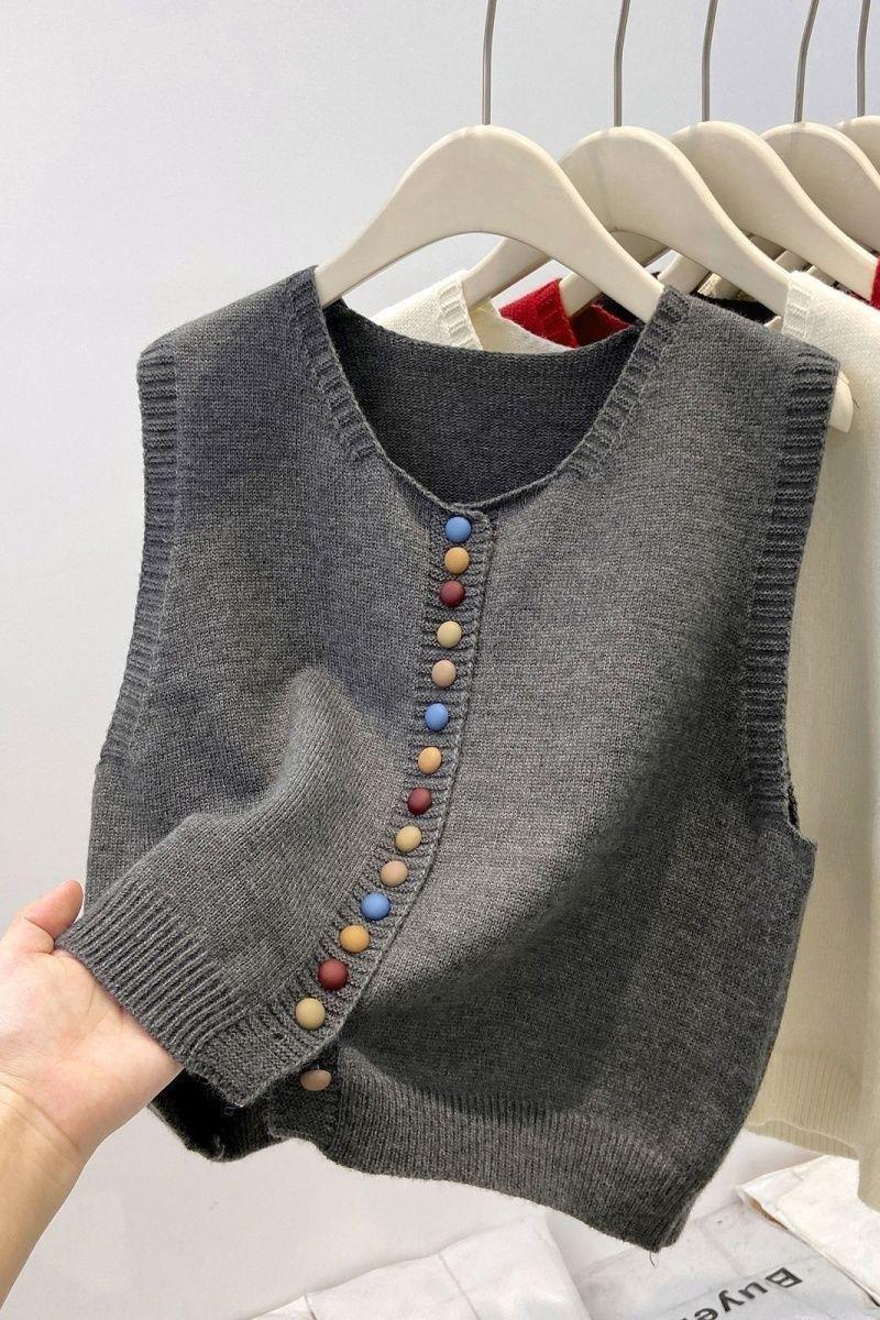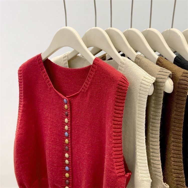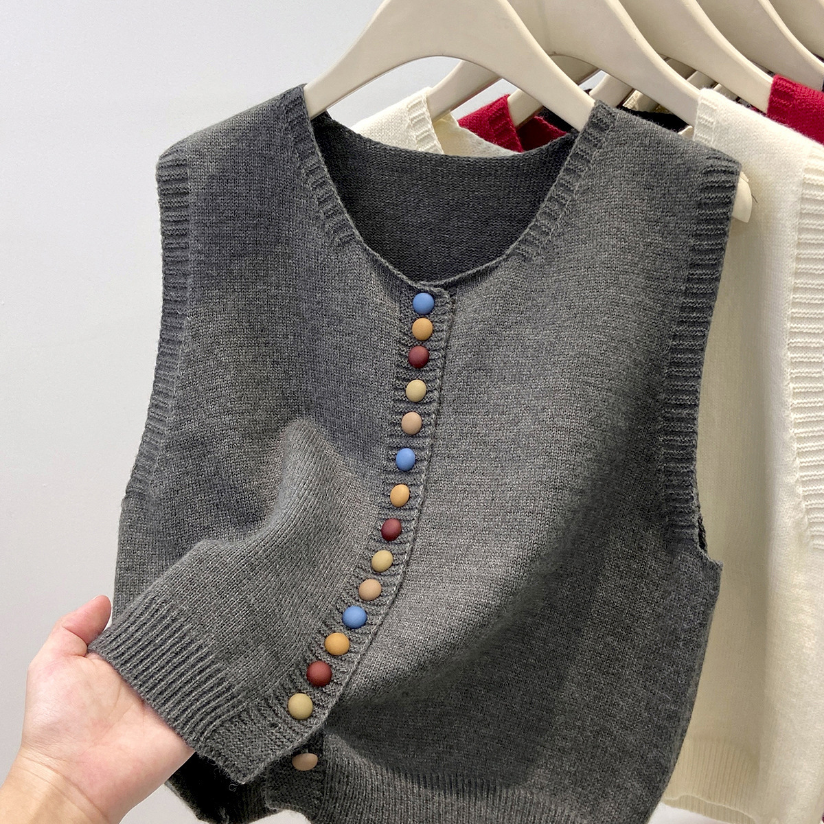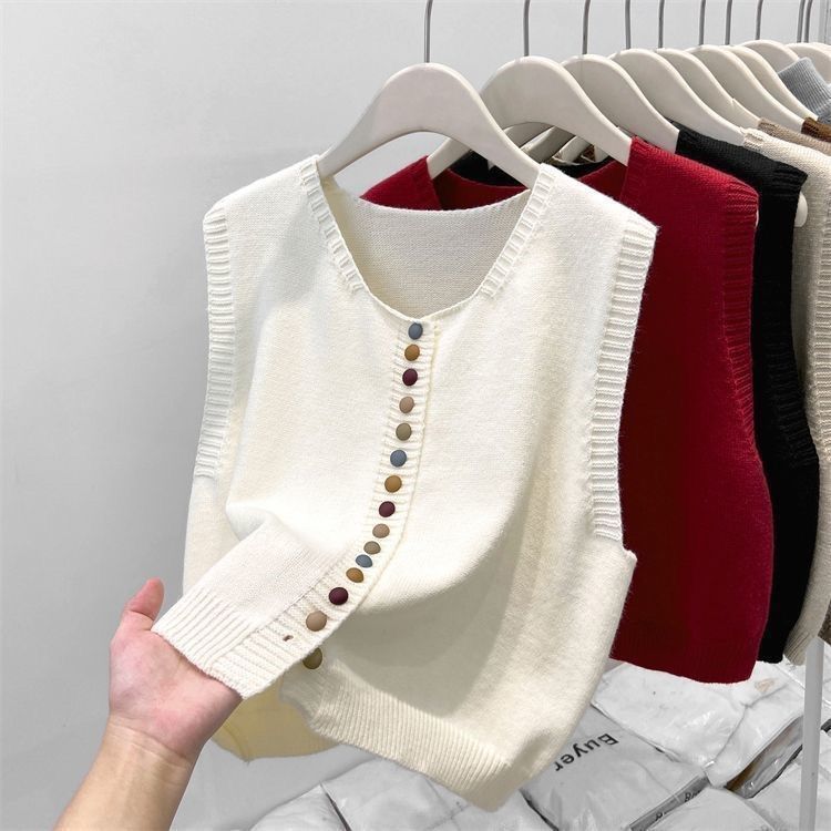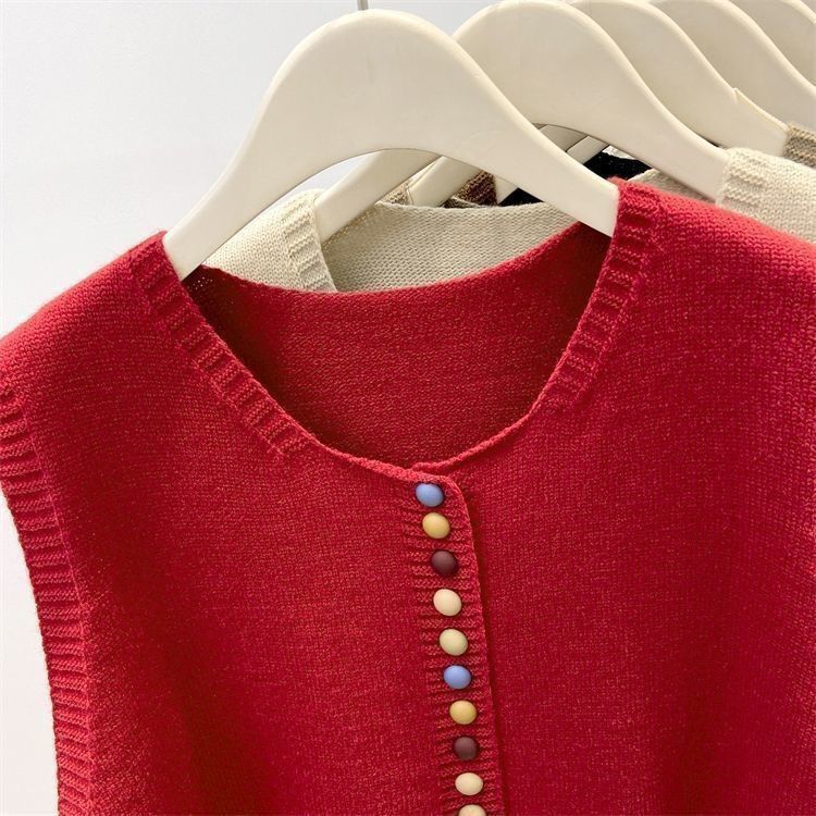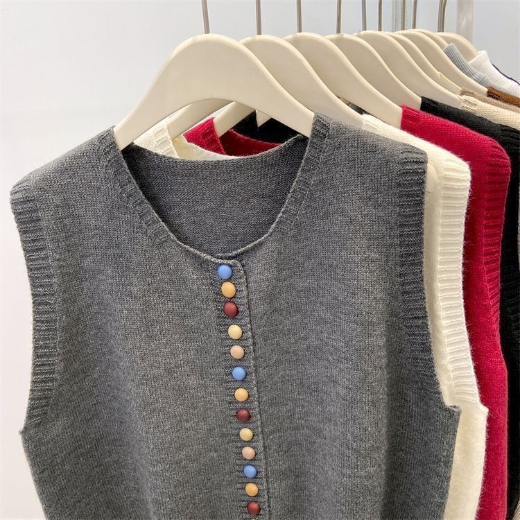 カラフルなボタンラウンドネックニットベスト女性のための春と秋の新しいルーズで多用途なノースリーブレイヤードセータースリミングベスト