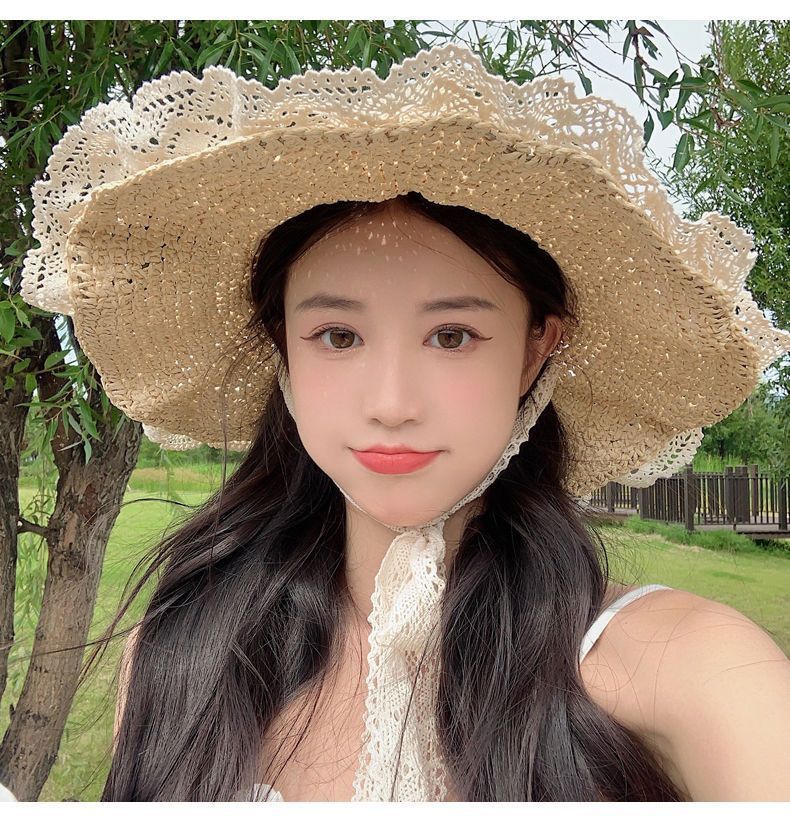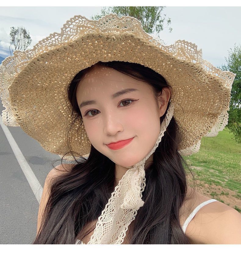 大きなつばのレースの麦わら帽子女性の夏のスーパーフェアリーシーサイド写真三亜日焼け止めサンハットビーチハットサンハット