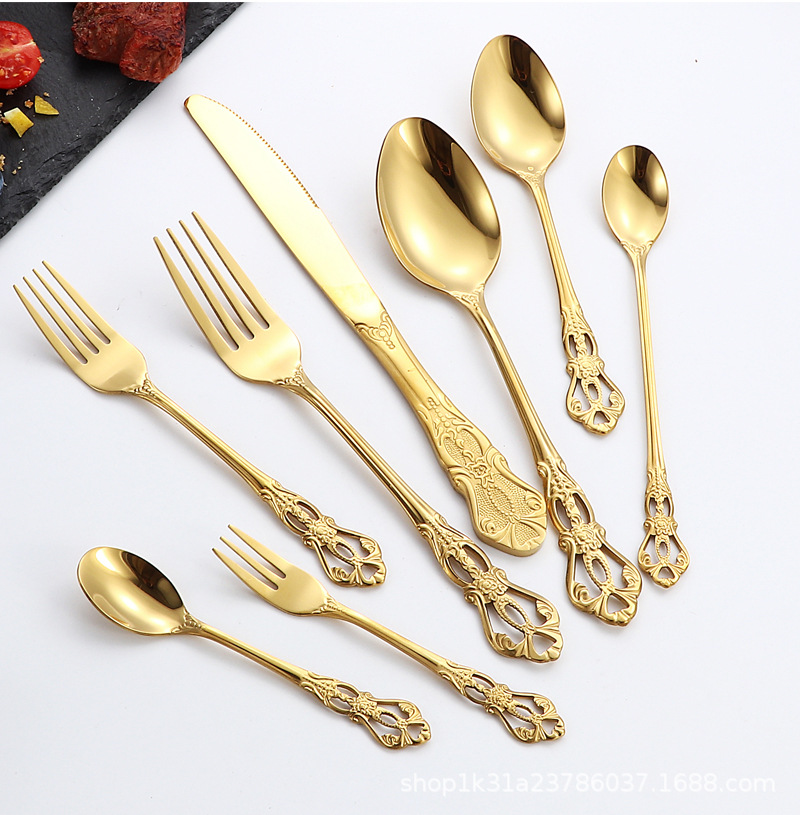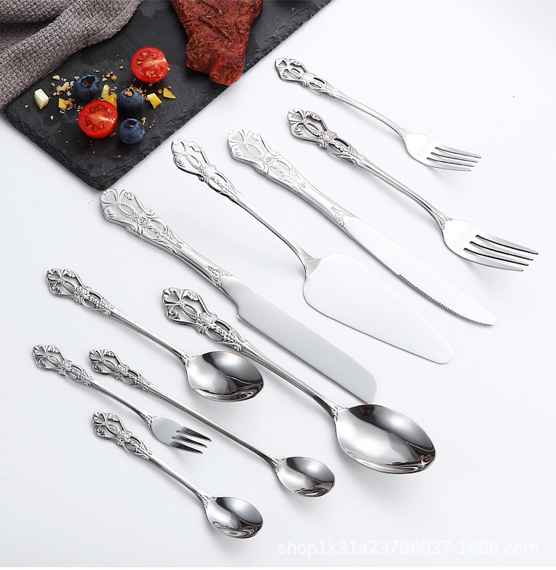 クロスボーダーレトロホテル洋食器ステンレスステーキナイフとフォークセット透かし彫りヨーロピアンスタイルロイヤルティンスプーン鏡面仕上げ