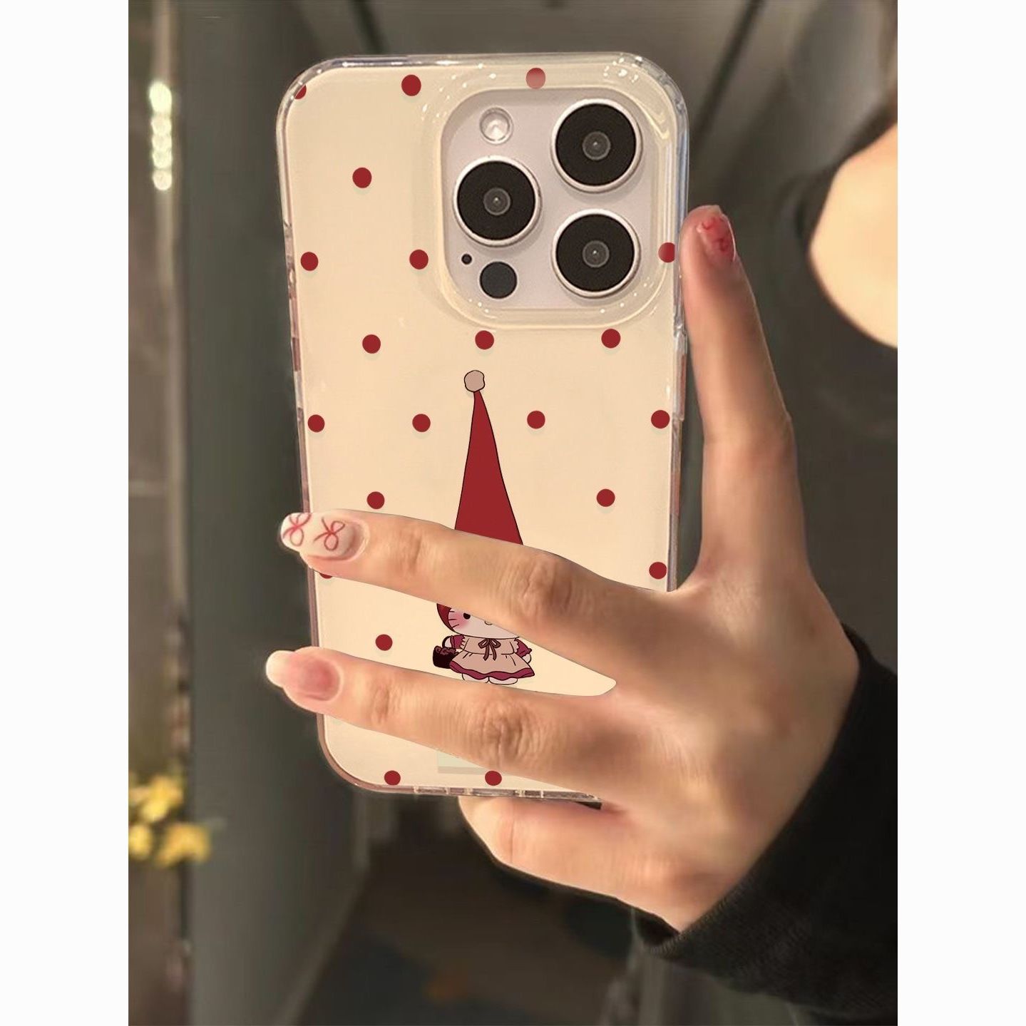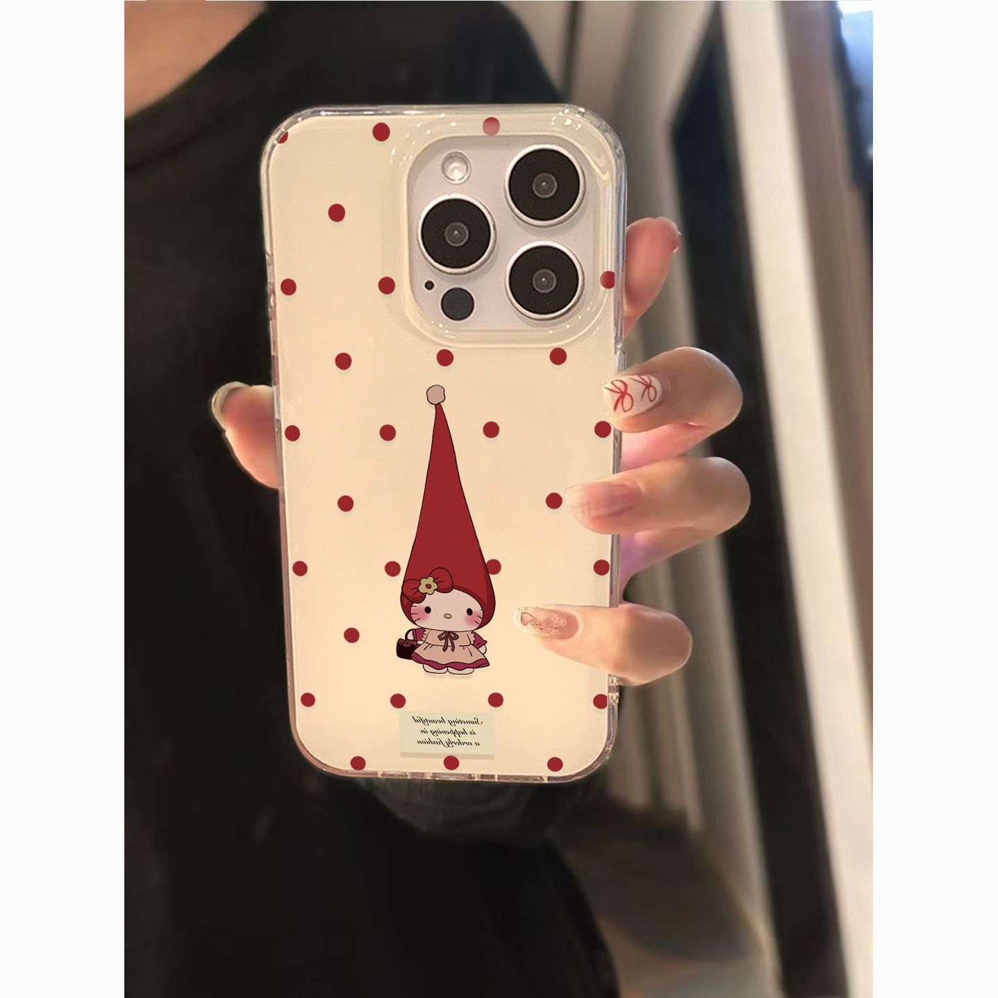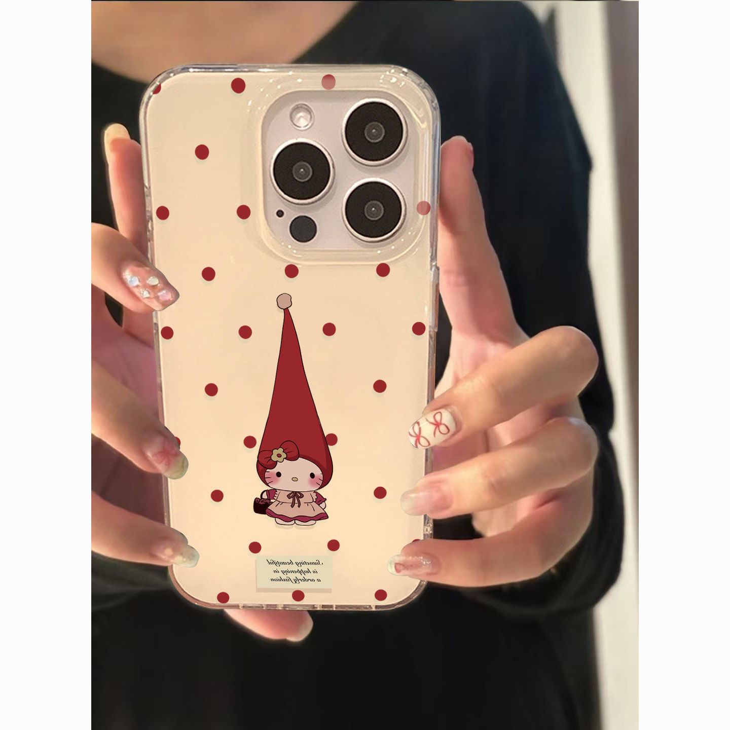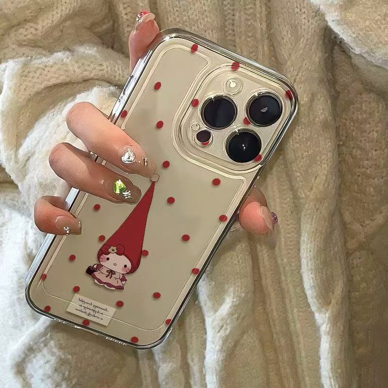 水玉模様の尖った帽子をかぶったキティ猫 iPhone17/16promax用スマホケース、Apple 15対応、白地、imd14/12対応