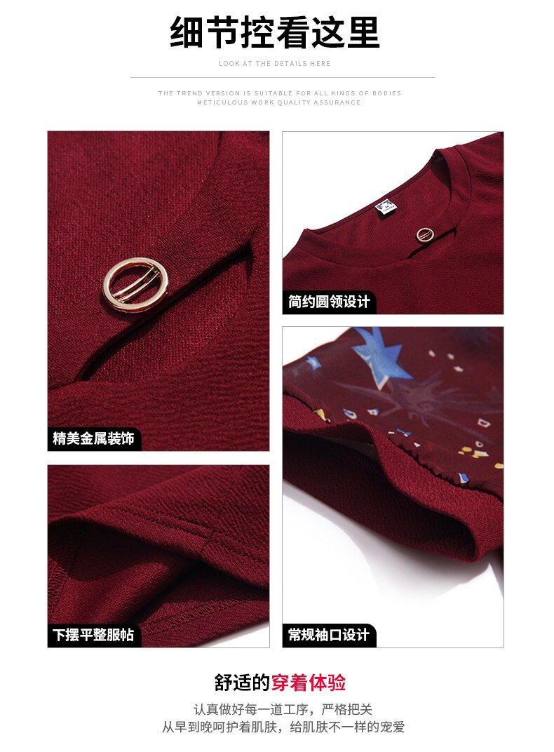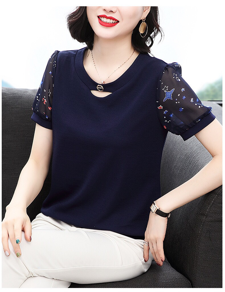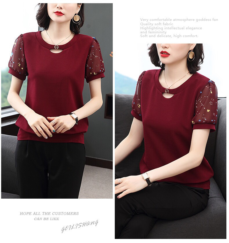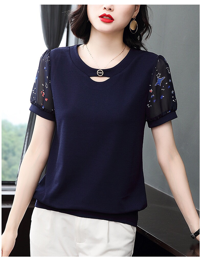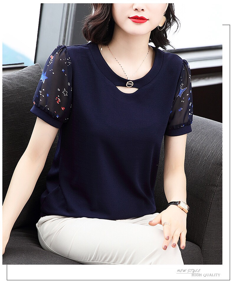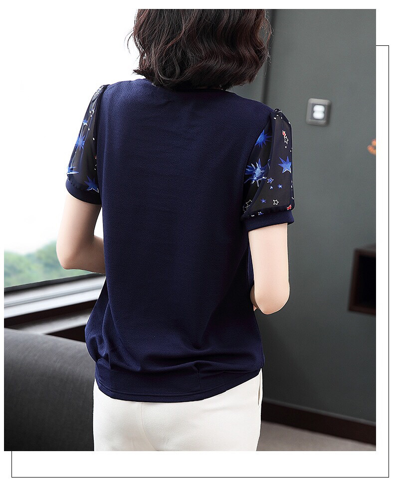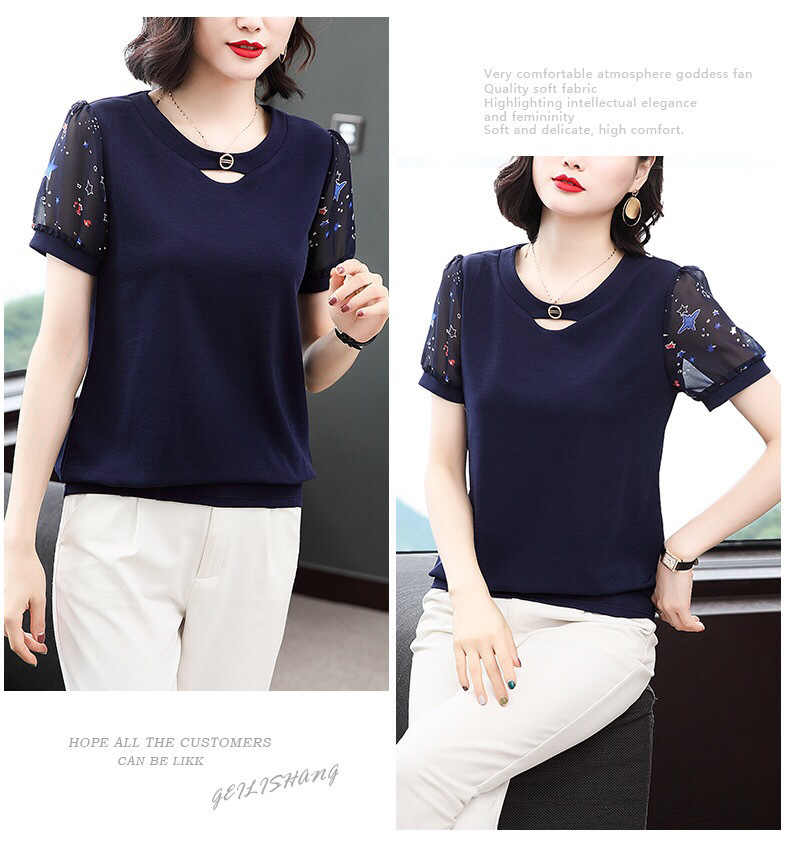 女性のプリントの半袖のシフォンのシャツの女性の上着の2025夏の新型の大きいサイズの婦人服は腹を覆います。