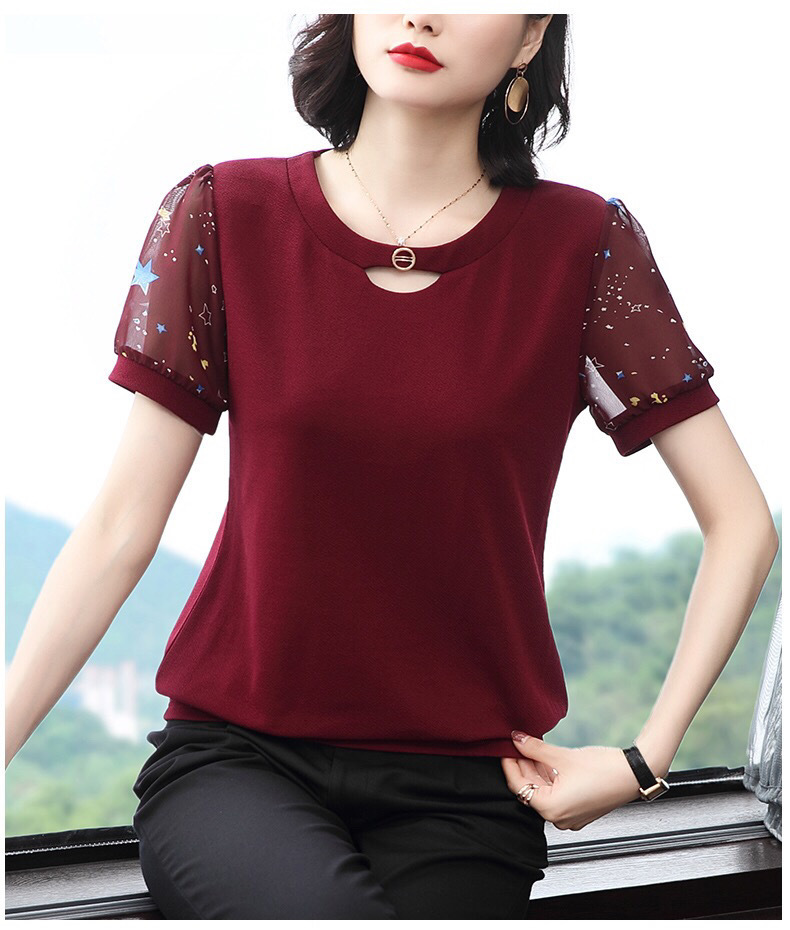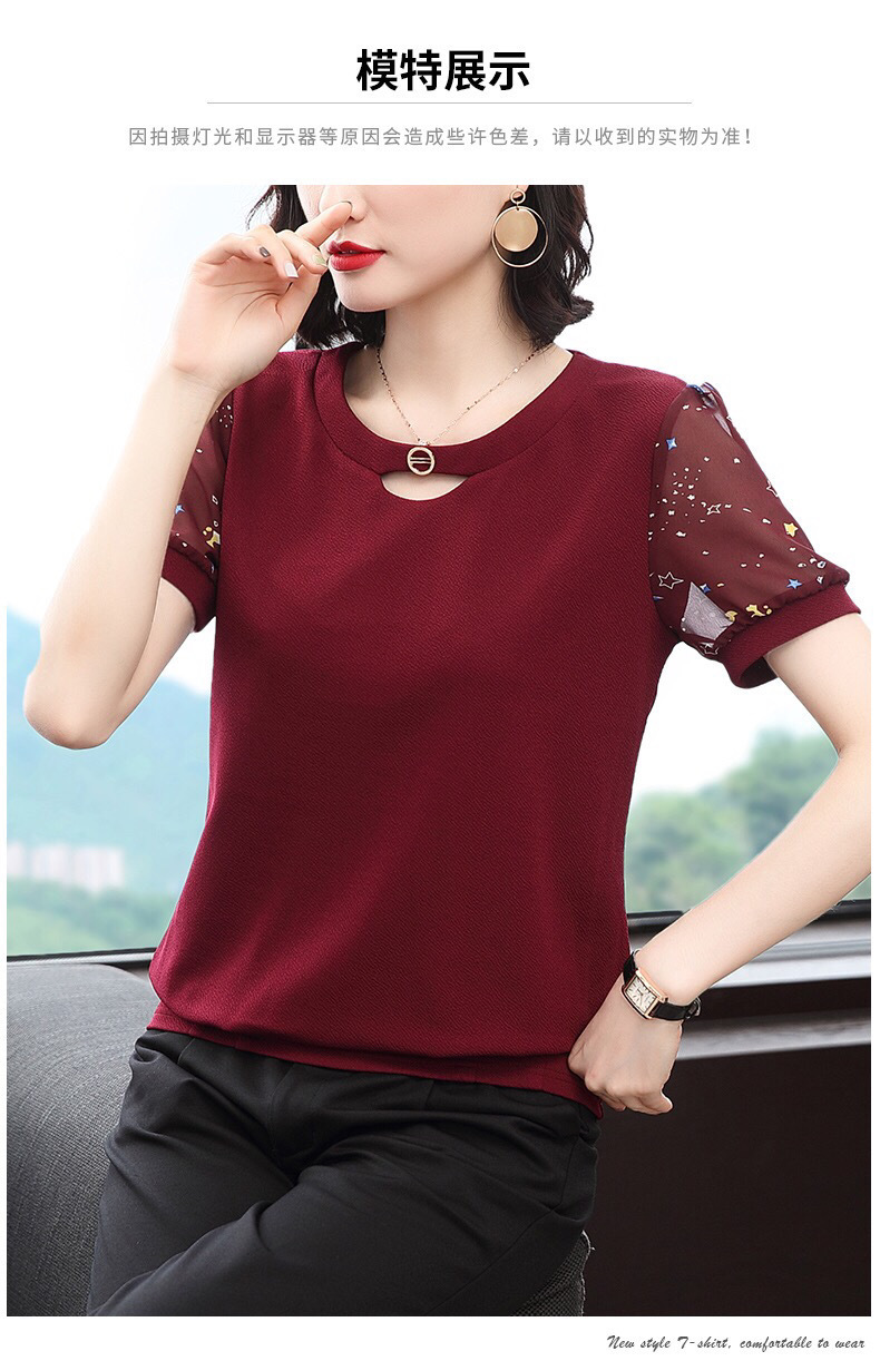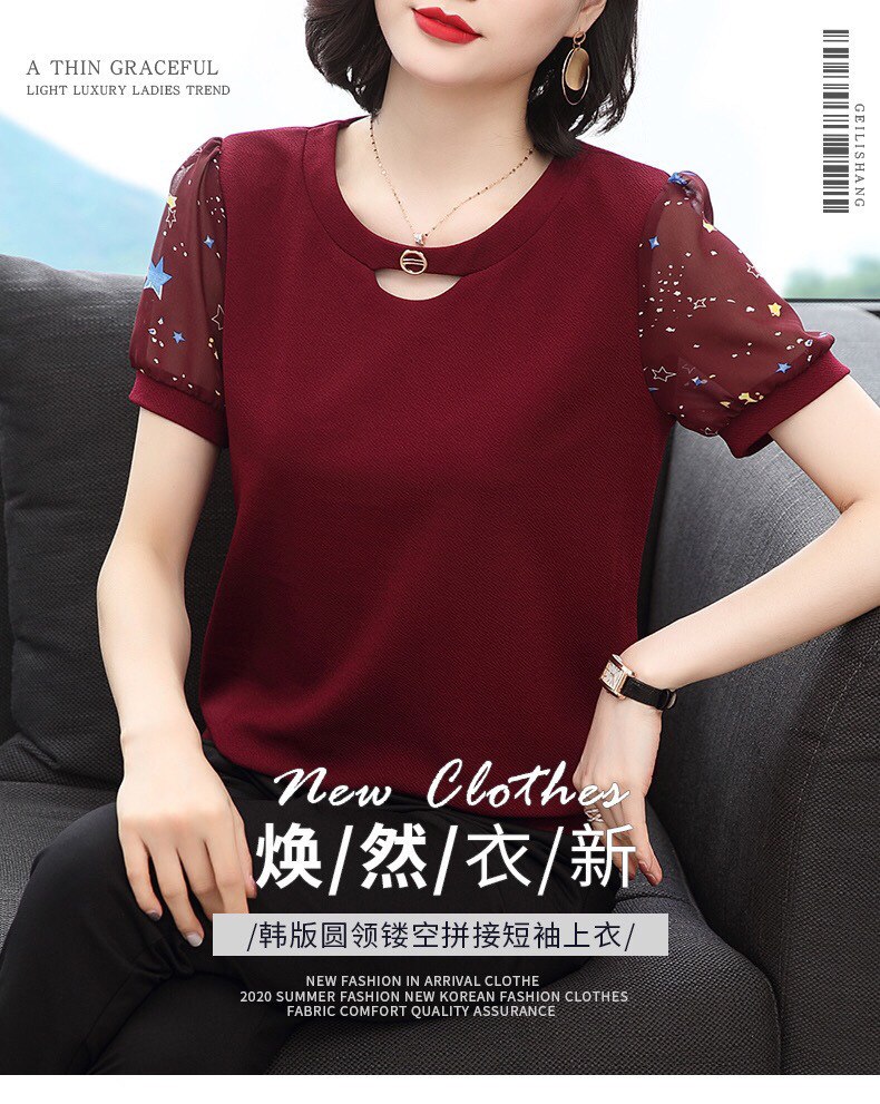 2025夏の新型レースの透かし彫りの襟の純色の半袖のtシャツの女性のファッションのゆったりしている年齢の気質の小さいシャツを減らします。