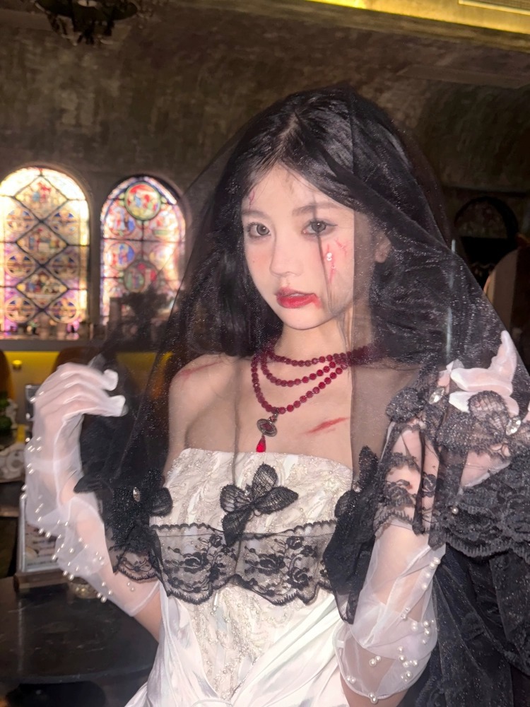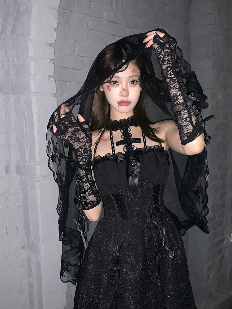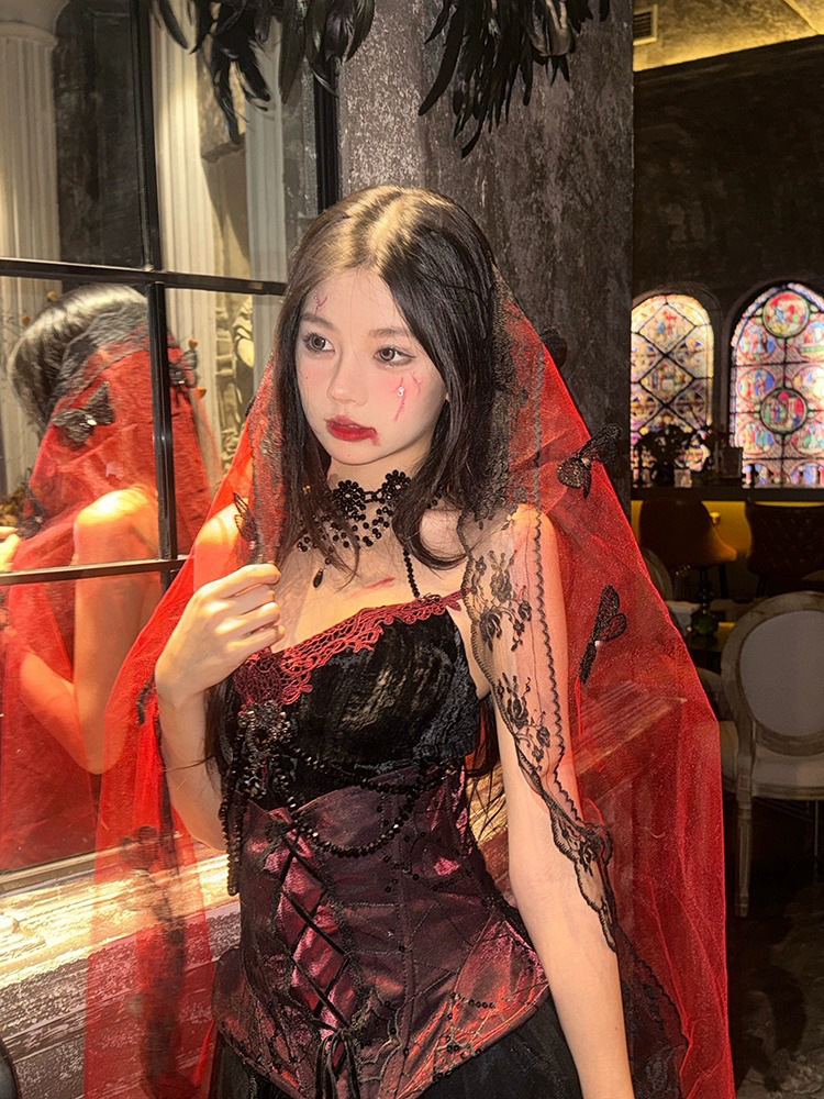 万圣节吸血鬼新娘红色蕾丝花边头纱哥特cos遮面盖头复古结婚头饰