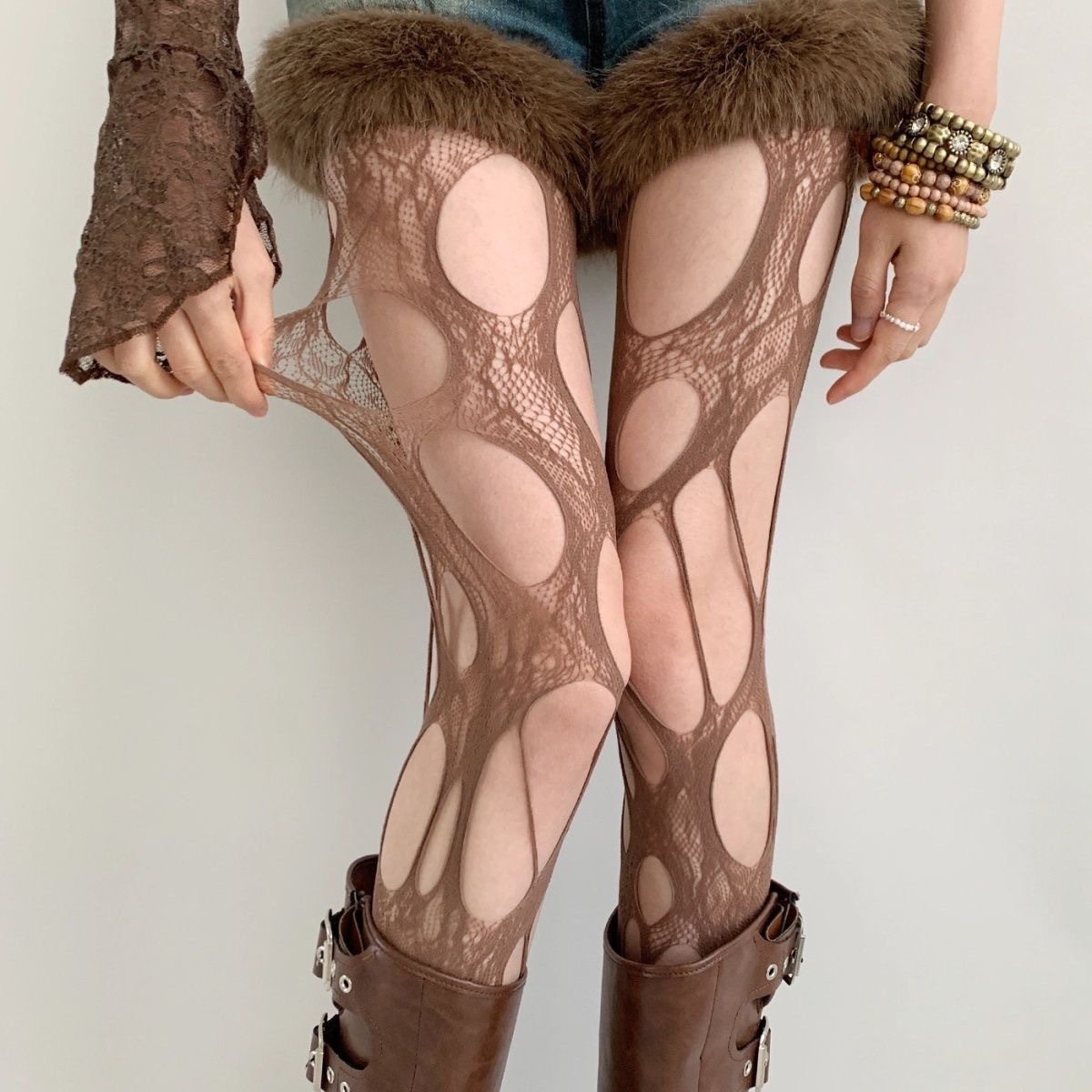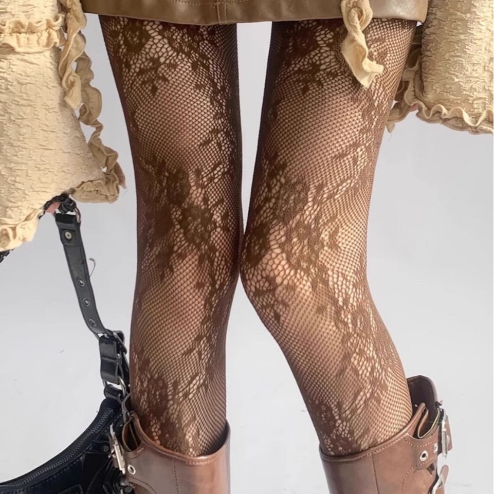 美拉德咖色网袜y2k复古辣妹镂空高弹渔网袜jk纯欲蕾丝提花连裤袜
