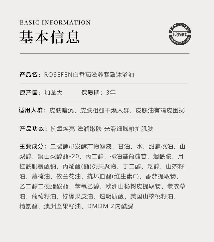 加拿大进口rosefen白番茄滋润紧致沐浴油舒缓清洁嫩留香以油养肤